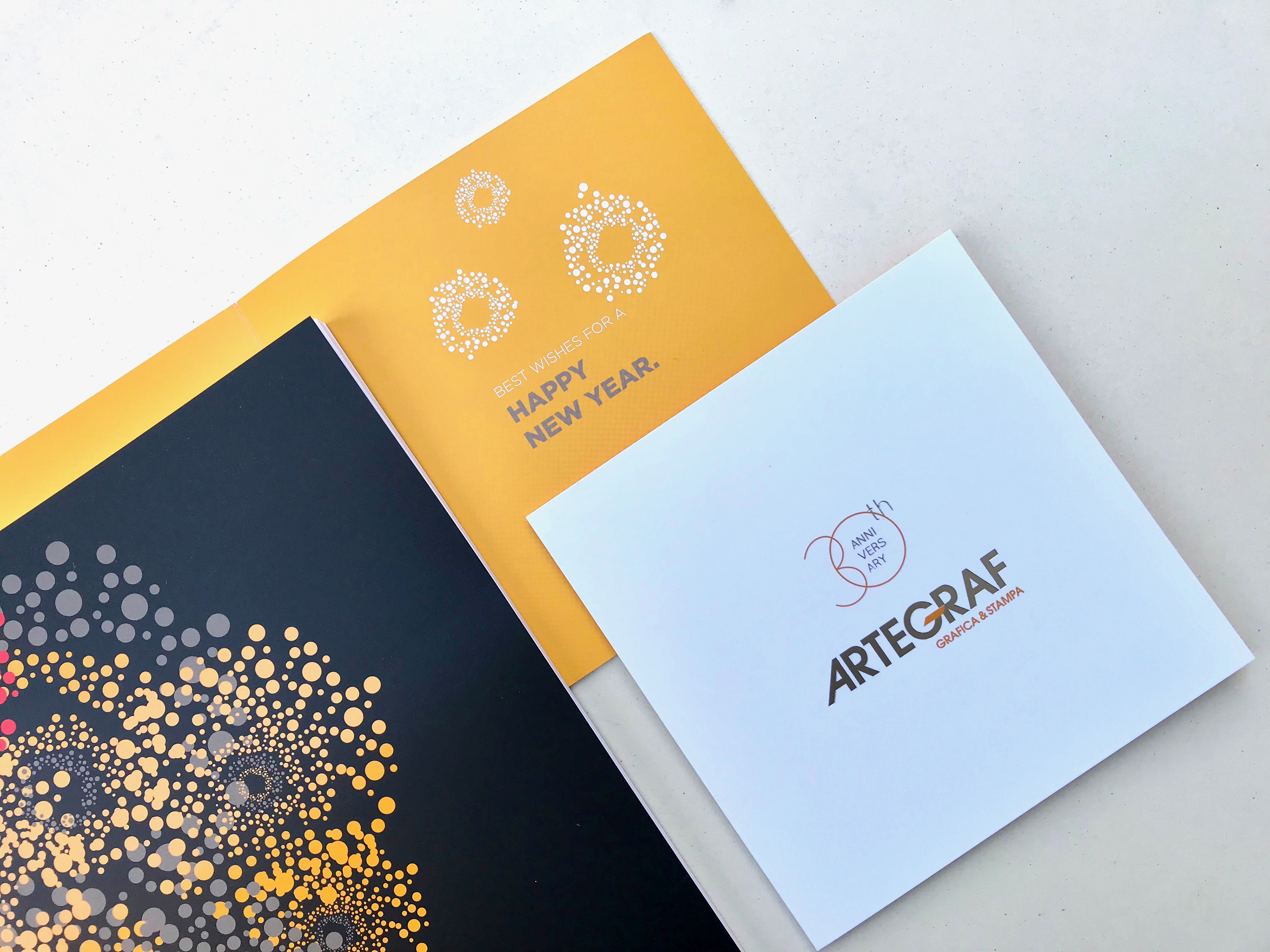 Pour célébrer les 30 ans de l'imprimerie italienne Artegraf, La Manufacture a sorti le feu d'artifice graphique ! L'identité éphémère évoque la multitude de projets réalisés par l'imprimerie, 1 point par projet… Le graphisme se décline sur calendriers, agendas, carnets et cahiers, coffrets cadeau, carte de vœux, déployant une palette de couleurs chic et festives, vives et riches.