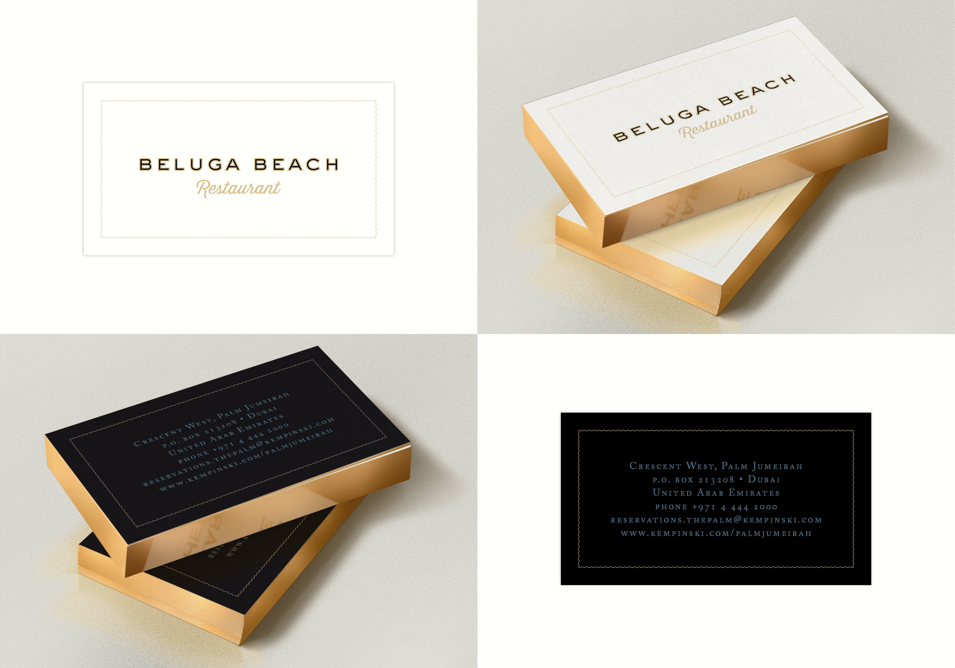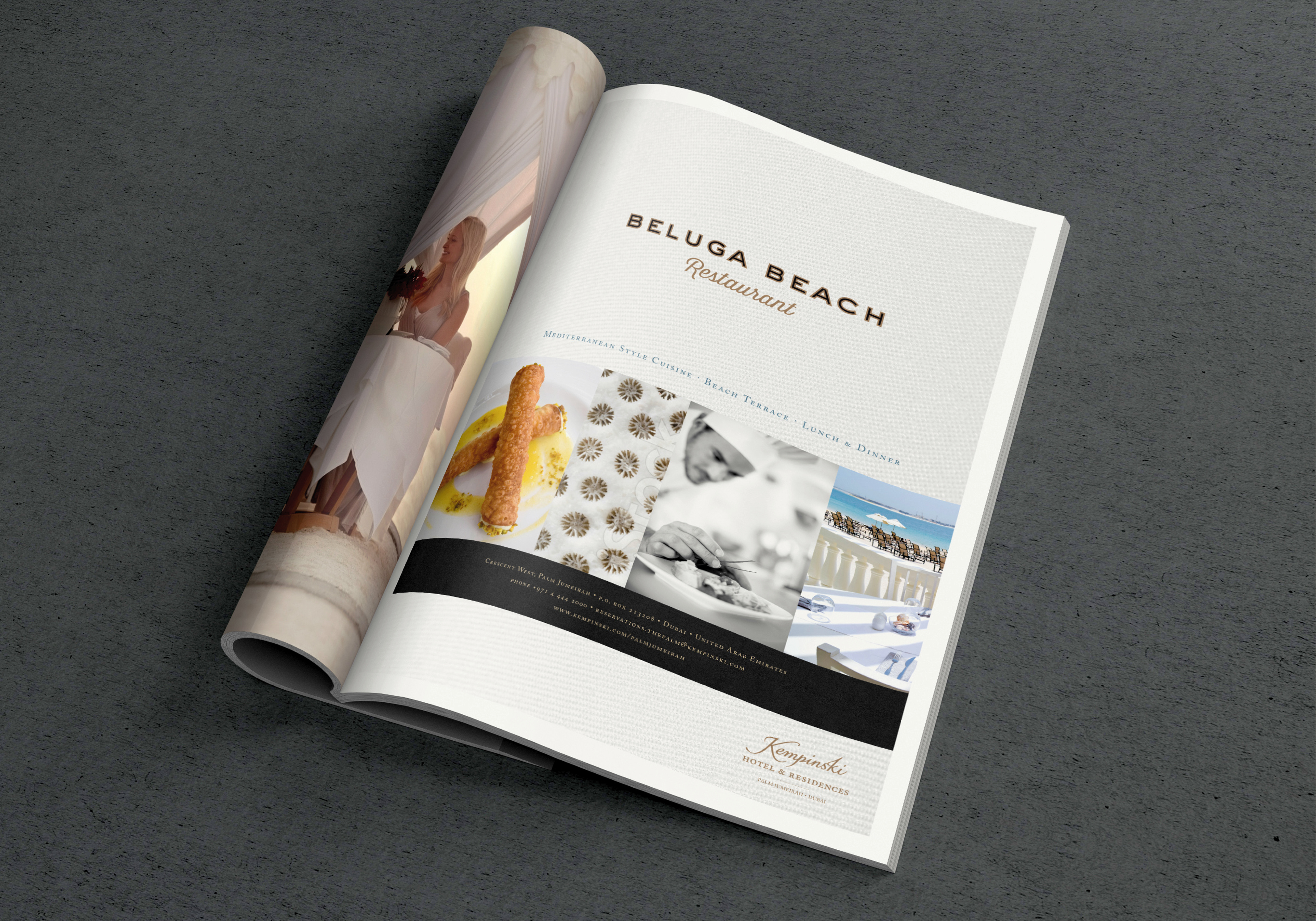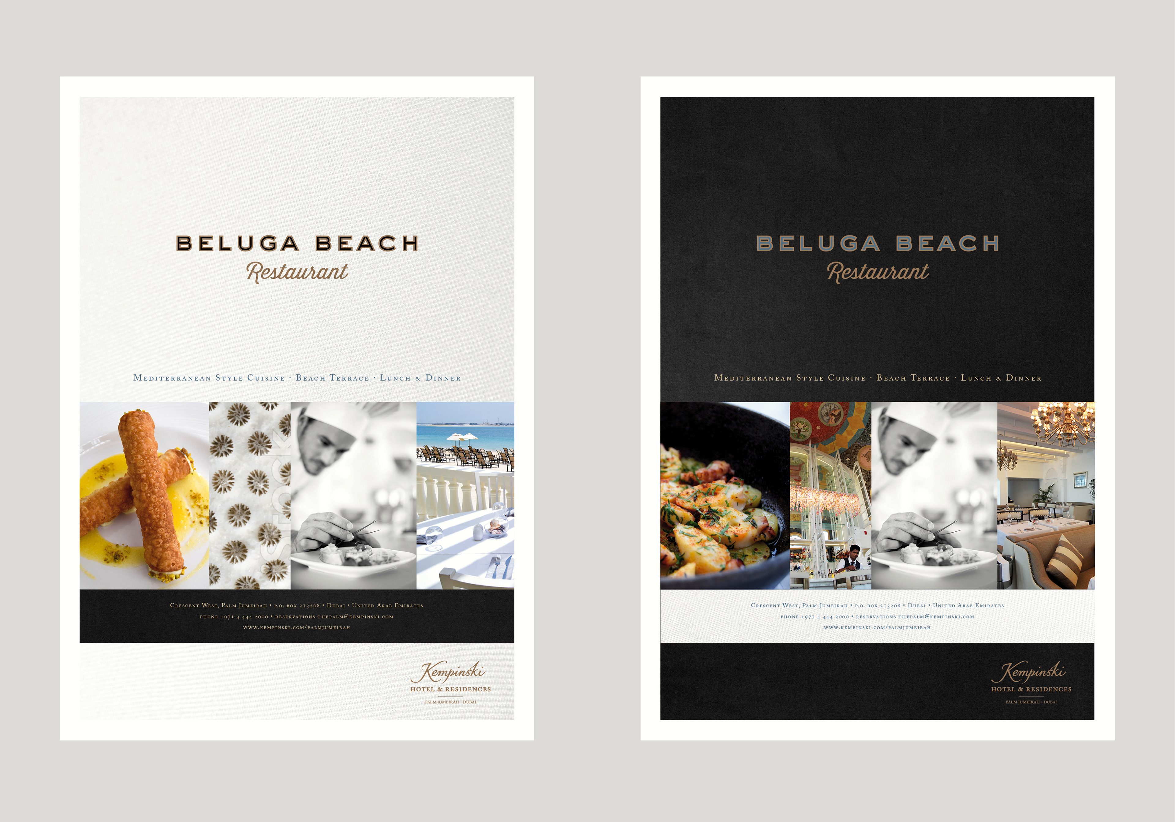 Identité visuelle pour Beluga Beach, le restaurant de plage de l'Hôtel Palm Jumeirah Kempinski à Dubaï. Logotype et univers visuel pour la promotion en annonce presse, affichage, mailing et réseaux sociaux.