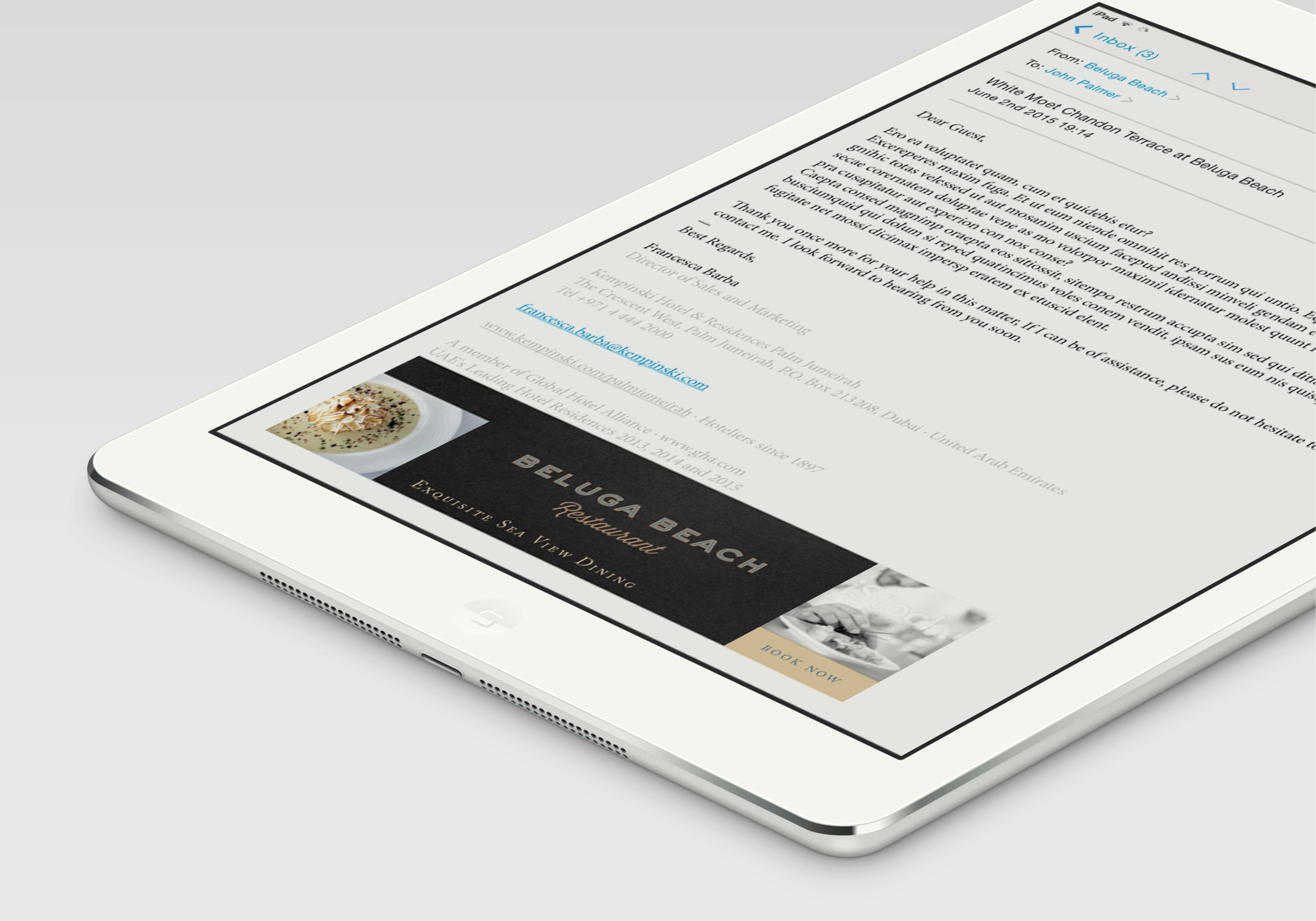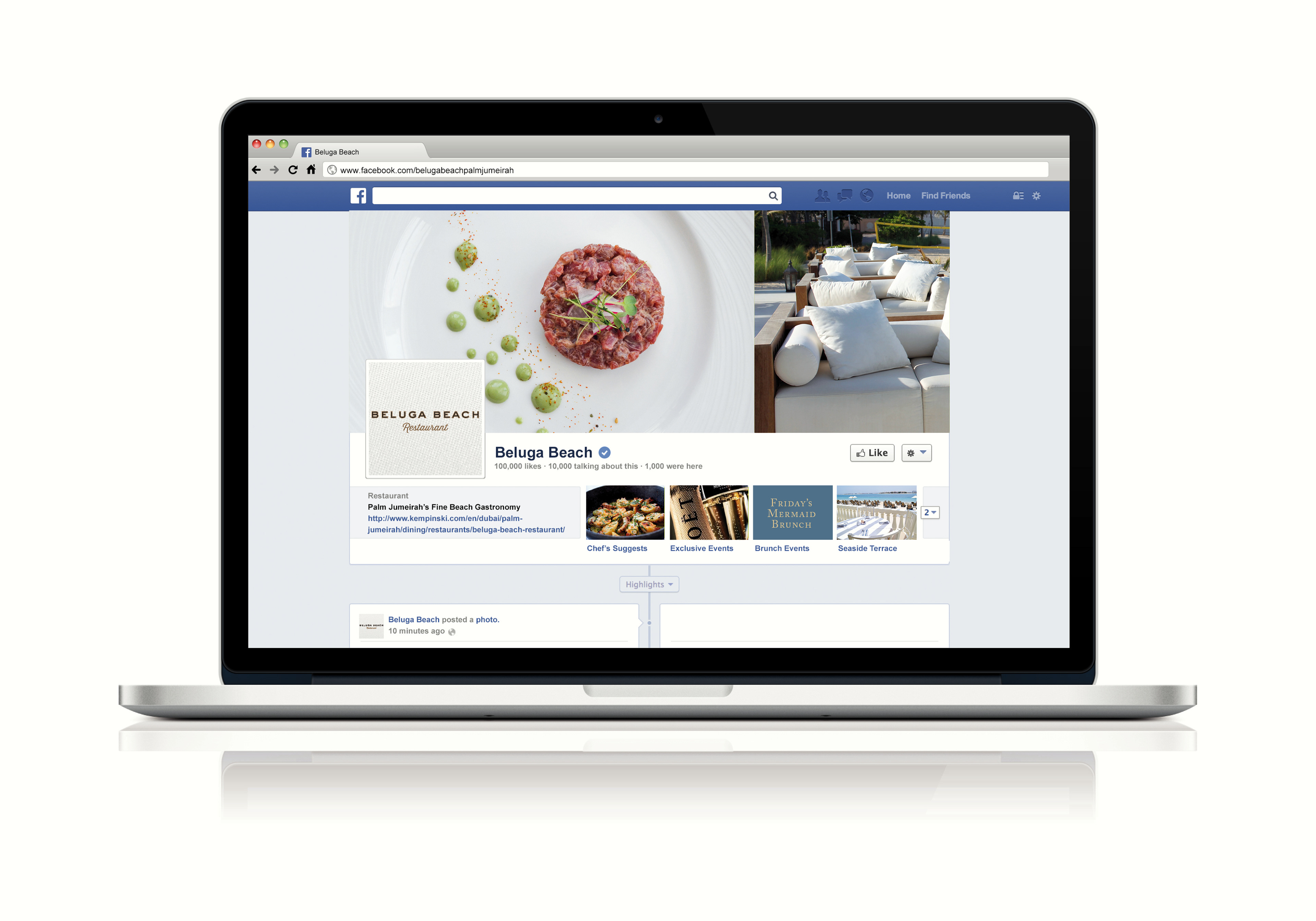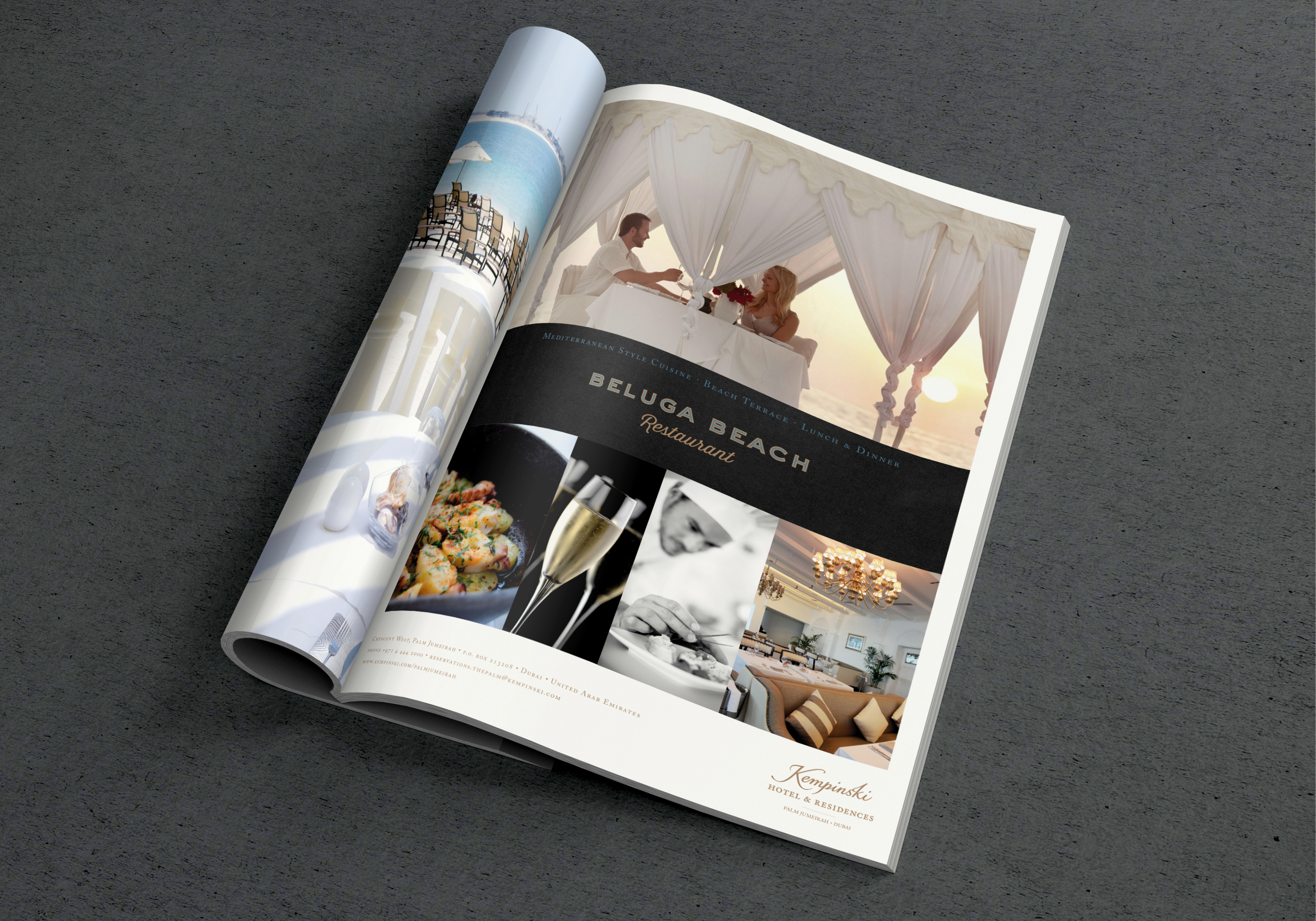 Identité visuelle pour Beluga Beach, le restaurant de plage de l'Hôtel Palm Jumeirah Kempinski à Dubaï. Logotype et univers visuel pour la promotion en annonce presse, affichage, mailing et réseaux sociaux.
