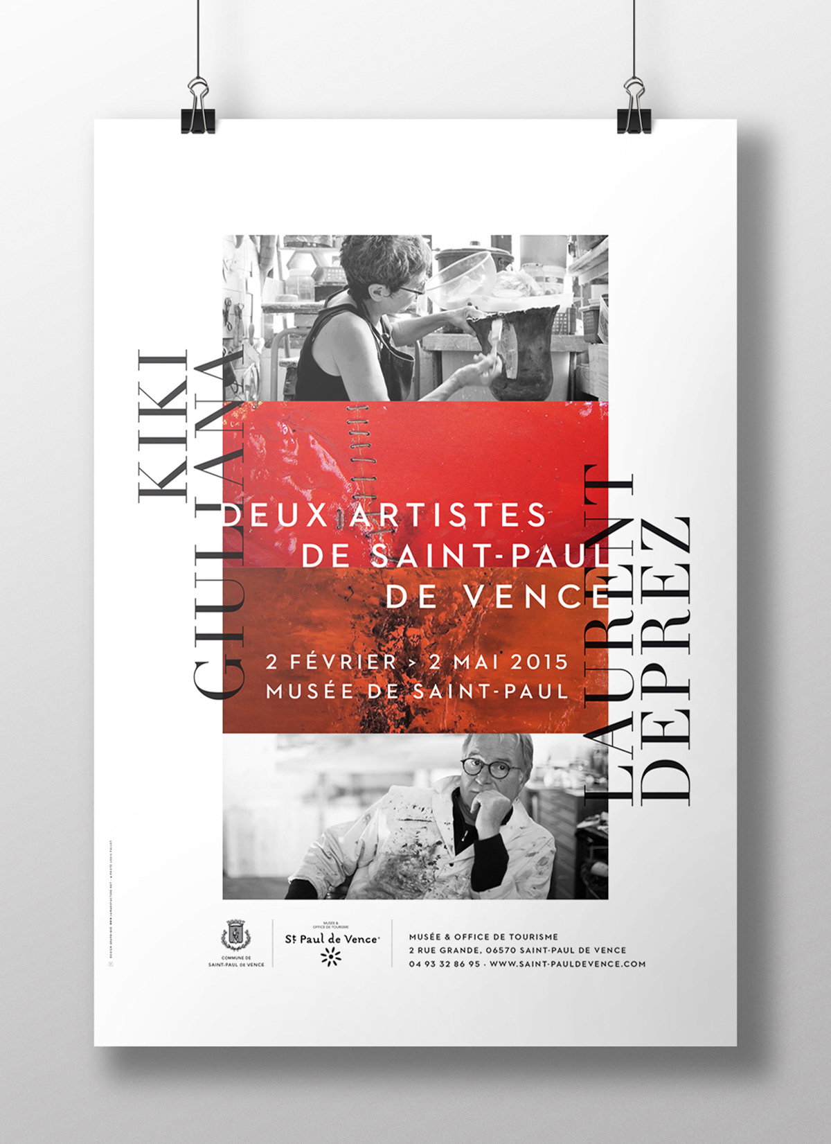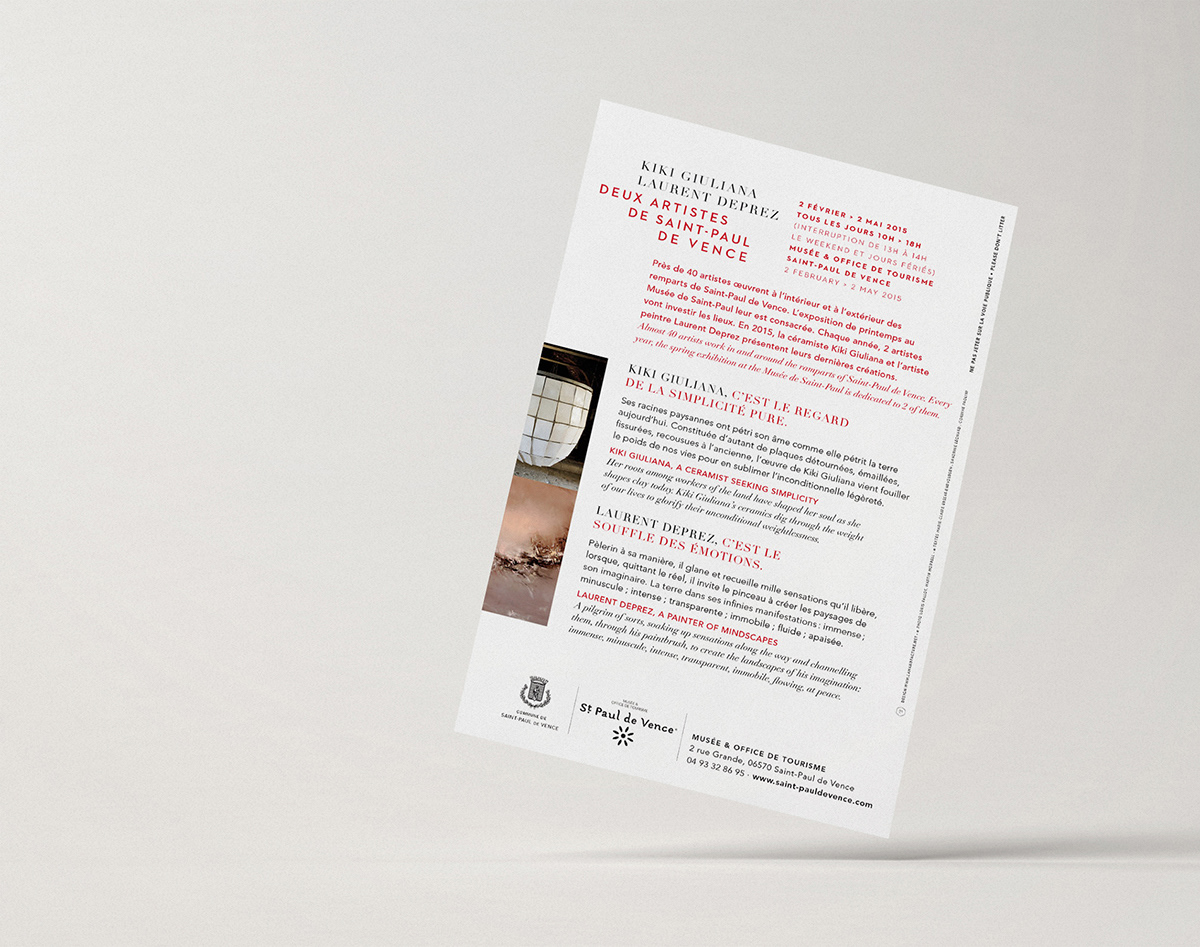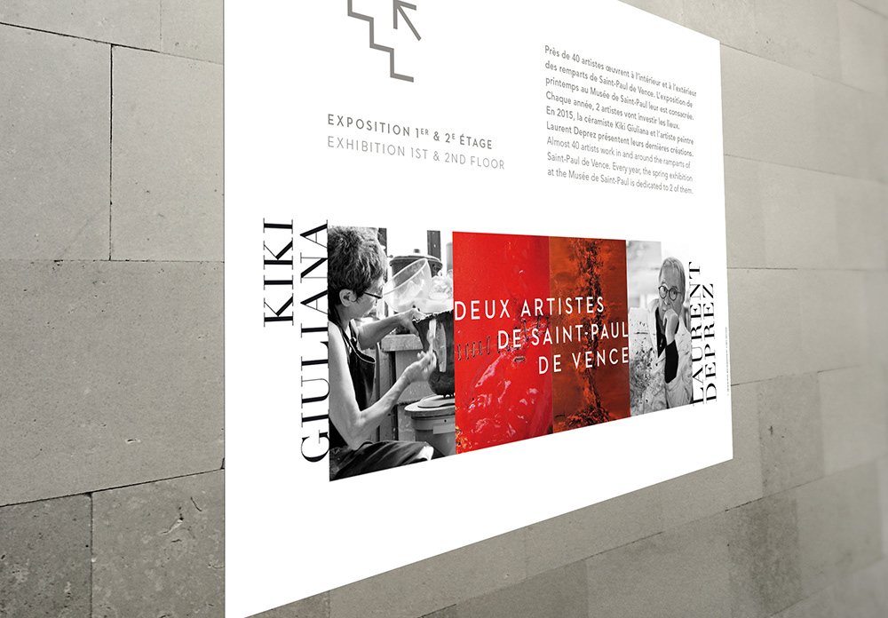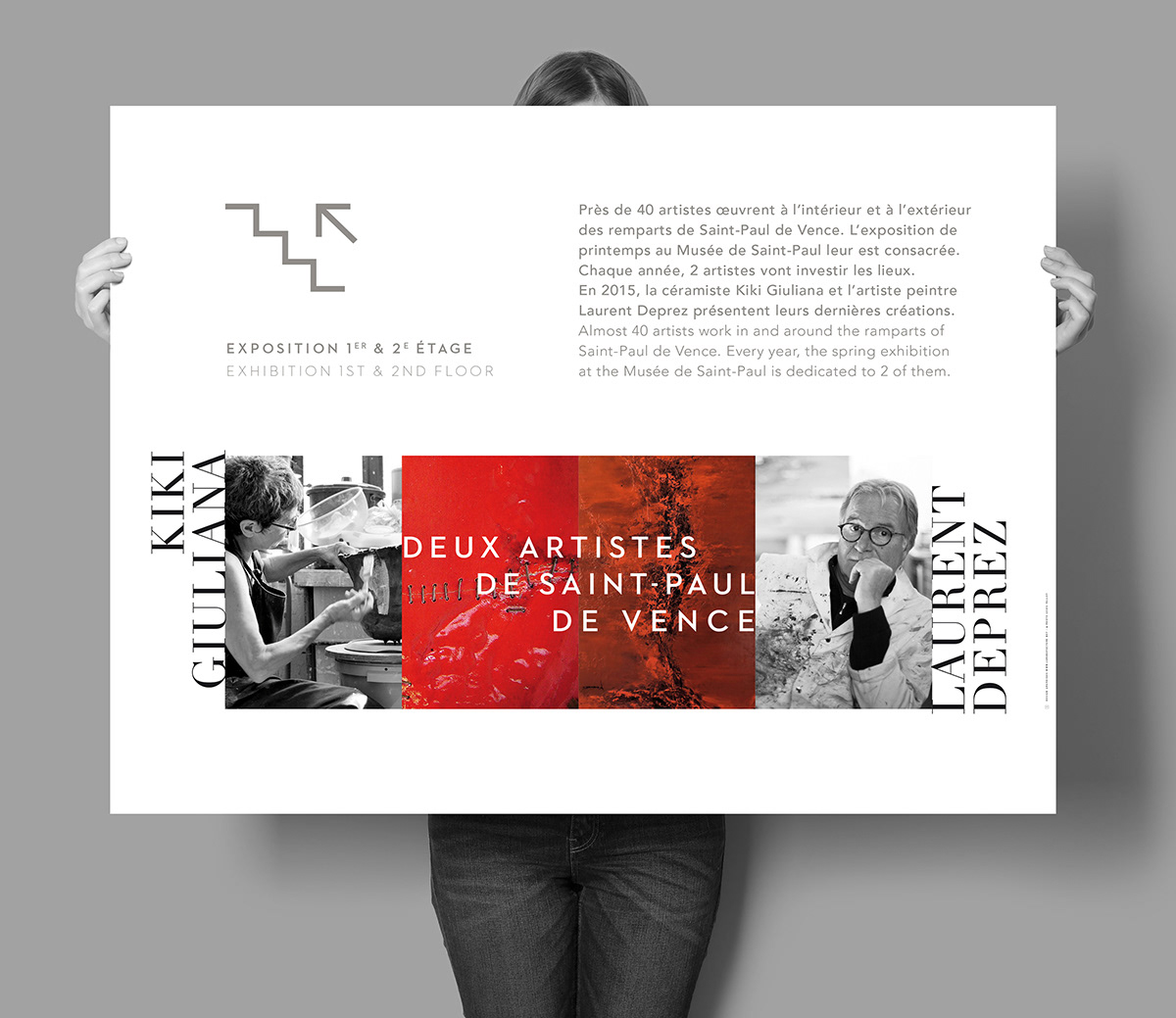 Près de 40 artistes œuvrent à l’intérieur et à l’extérieur des remparts de Saint-Paul de Vence. L’exposition de printemps au Musée de Saint-Paul leur est consacrée. Chaque année, 2 artistes locaux investissent les lieux. La Manufacture a imaginé un concept d'affiche et de flyer assorti, qui pourra être décliné chaque année avec la présentation de 2 nouveaux artistes.
