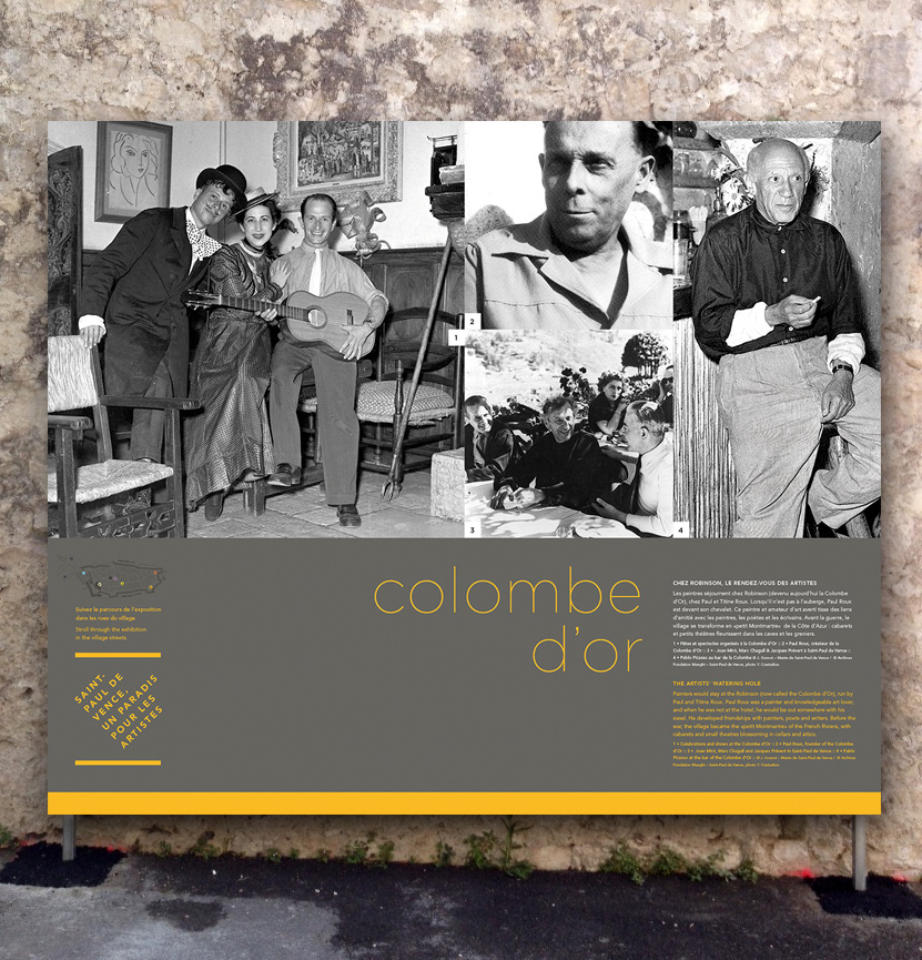 Dans les rues du village provençal Saint-Paul de Vence, un parcours de photographies, présentées en 6 grands tableaux, éclaire le visiteur sur l’attachement des artistes à Saint-Paul de Vence, leur admiration pour la qualité de la lumière et la beauté du paysage. Pour cette exposition à découvrir dès le 1e juillet 2014, La Manufacture a mis en scène 6 thèmes sur 6 panneaux, avec plan du parcours, le tout développé avec un graphisme fort et contemporain qui s'intègre harmonieusement dans l'environnement des rues du village.