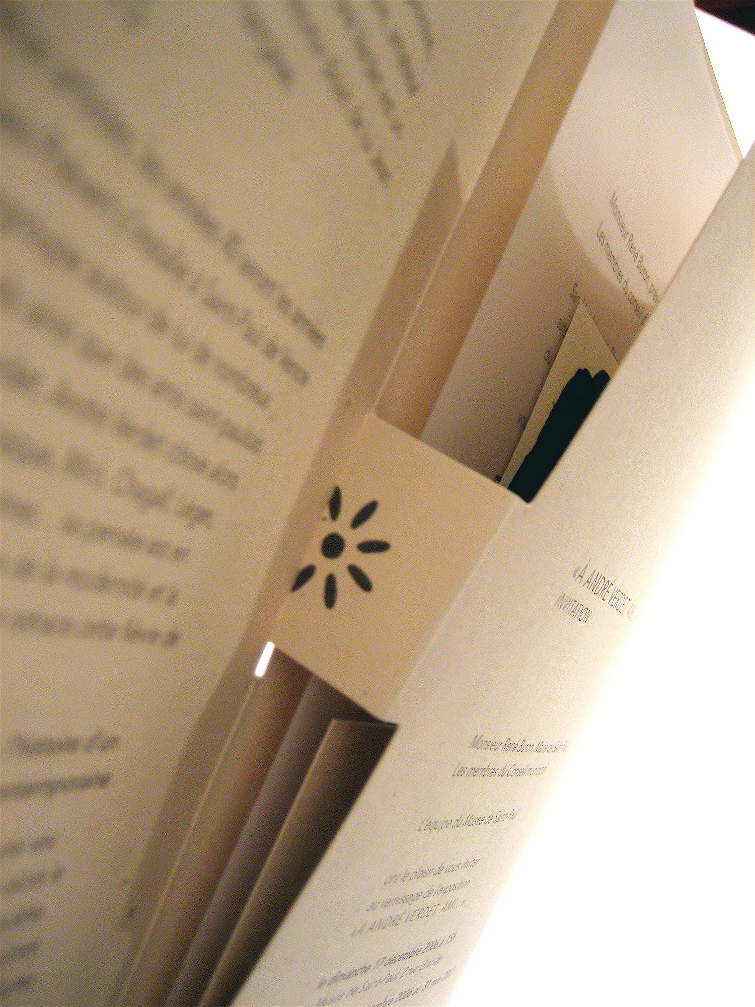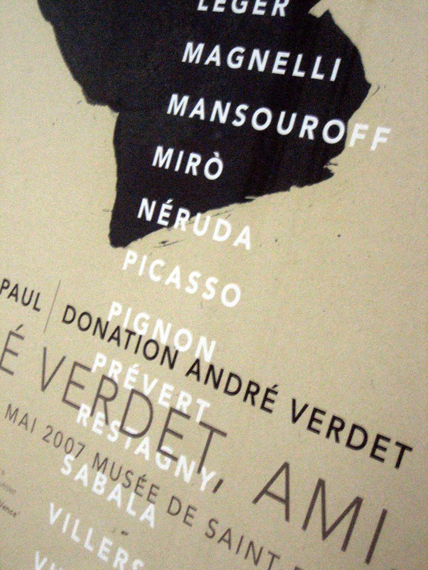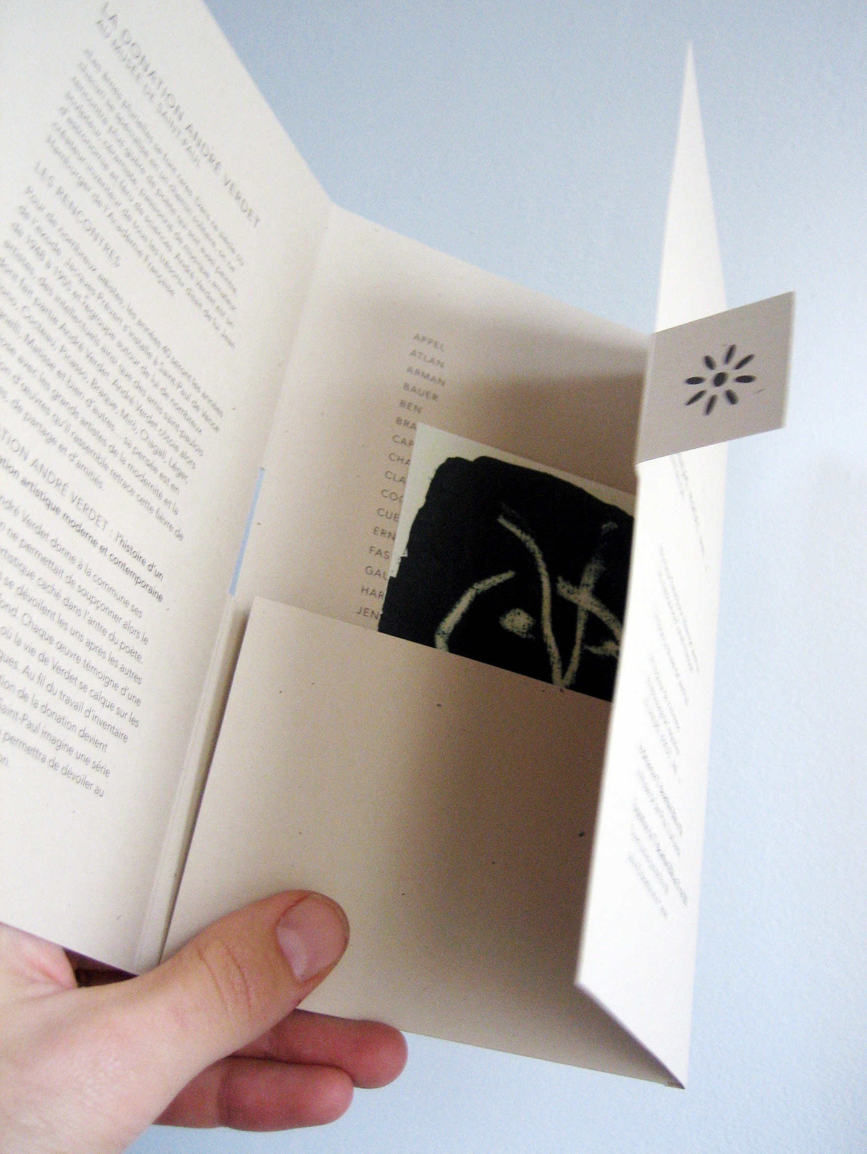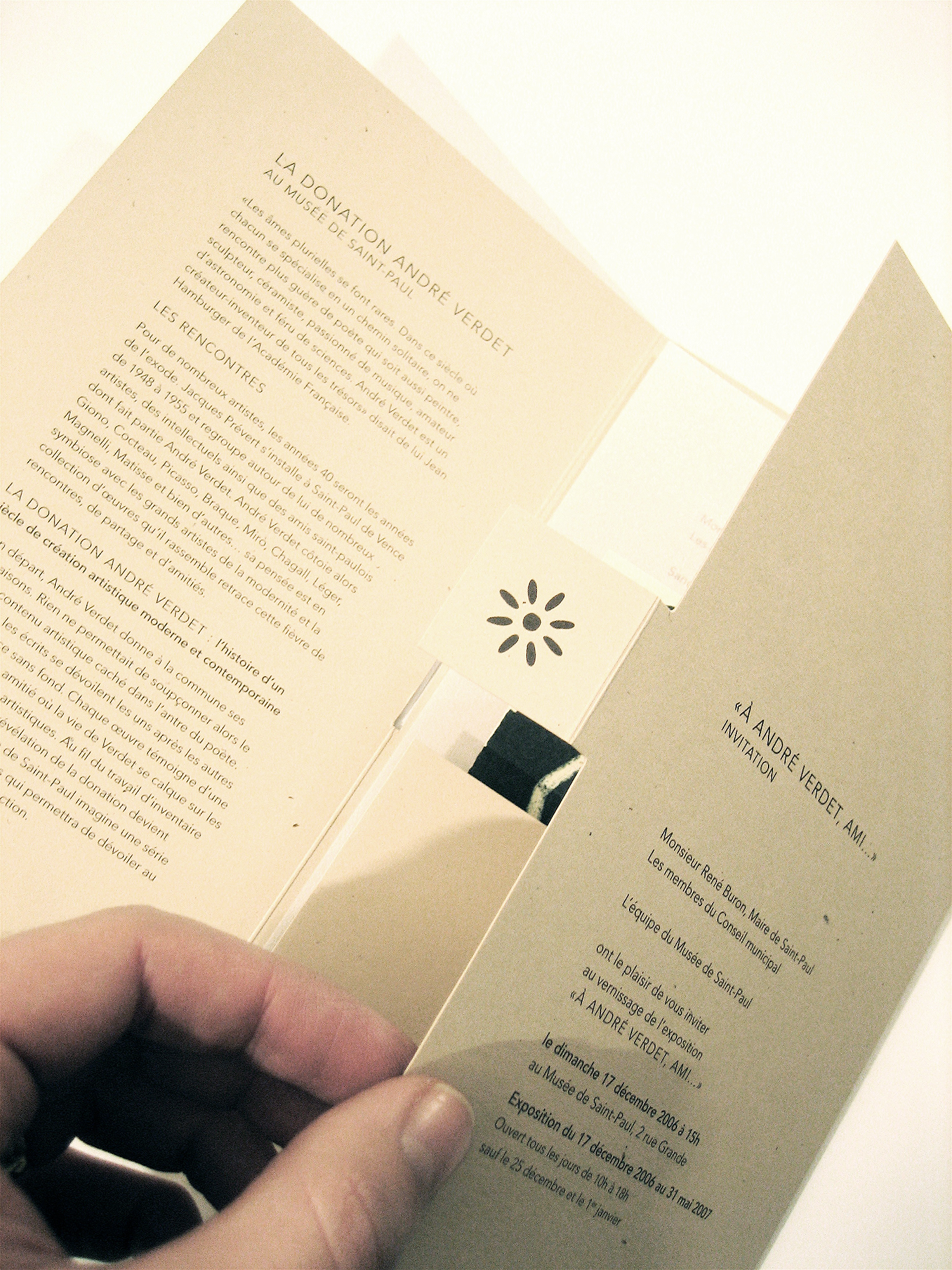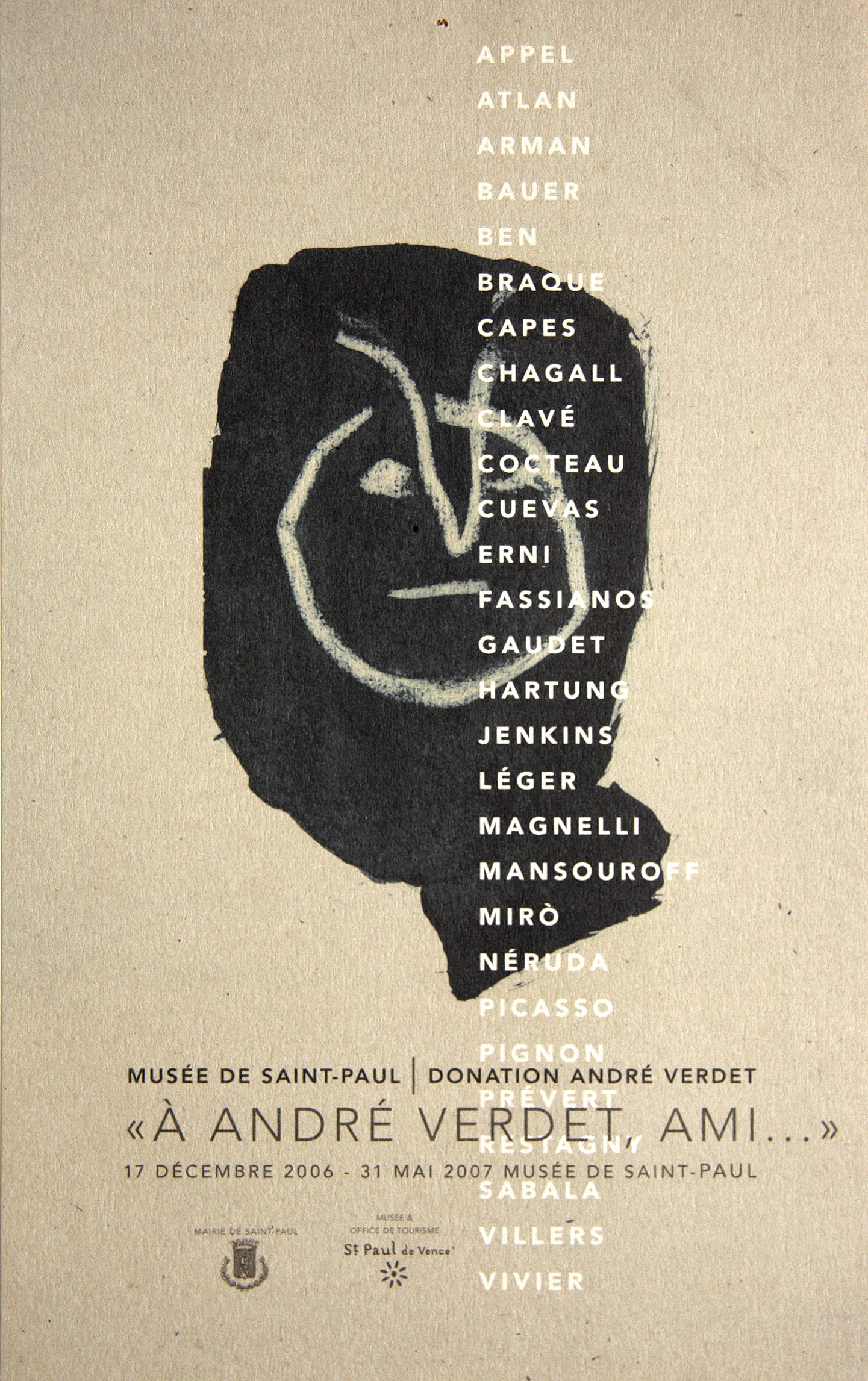 Conception d'affiche, invitation vernissage et pochette programme avec tiré à part, pour l'exposition "André Verdet, Ami" au Musée de Saint-Paul de Vence.