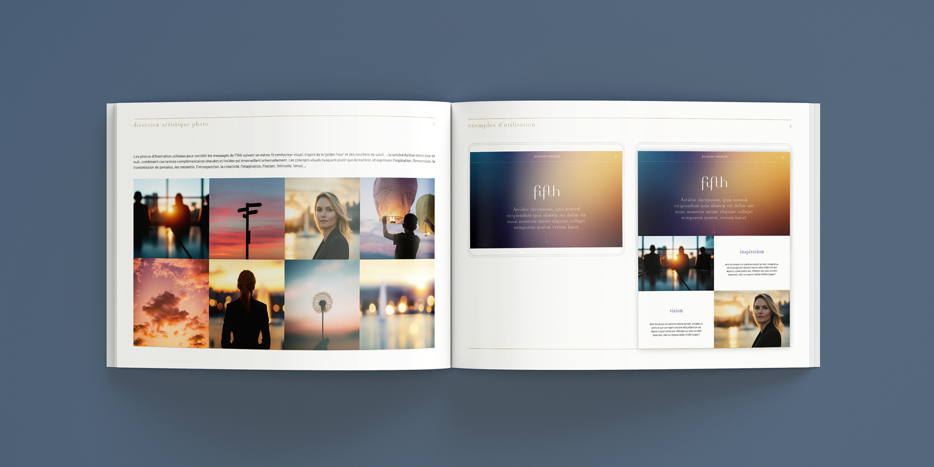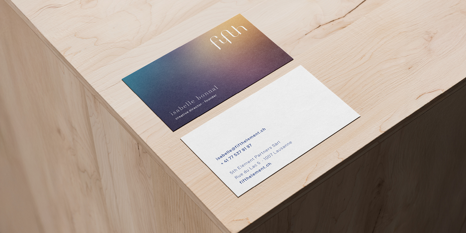 FIFTH puise son nom dans le « cinquième élément » : l’éther, souffle vital qui relie et transcende. À cette image, FIFTH aide ses clients à révéler leur essence et bâtir une identité singulière et durable. Son logotype, tracé continu inspiré de la spirale de l’ADN, symbolise pensée en mouvement, singularité et progression — reflet d’une démarche d’écoute et de transformation. Le dégradé chromatique, entre chaleur solaire et profondeur du bleu nuit, évoque la golden hour : ce moment universel d’apaisement et d’inspiration. Il devient la métaphore de l’accompagnement de FIFTH, fait de confiance et de clarté. FIFTH n’est donc pas qu’une signature graphique, mais un langage visuel où stratégie et émotion se rejoignent. La Manufacture y affirme son expertise : créer des identités qui équilibrent fond et forme, pour résonner durablement.