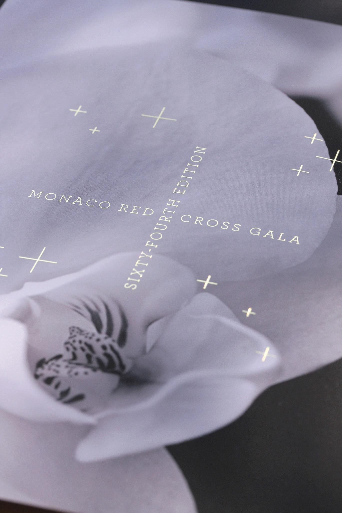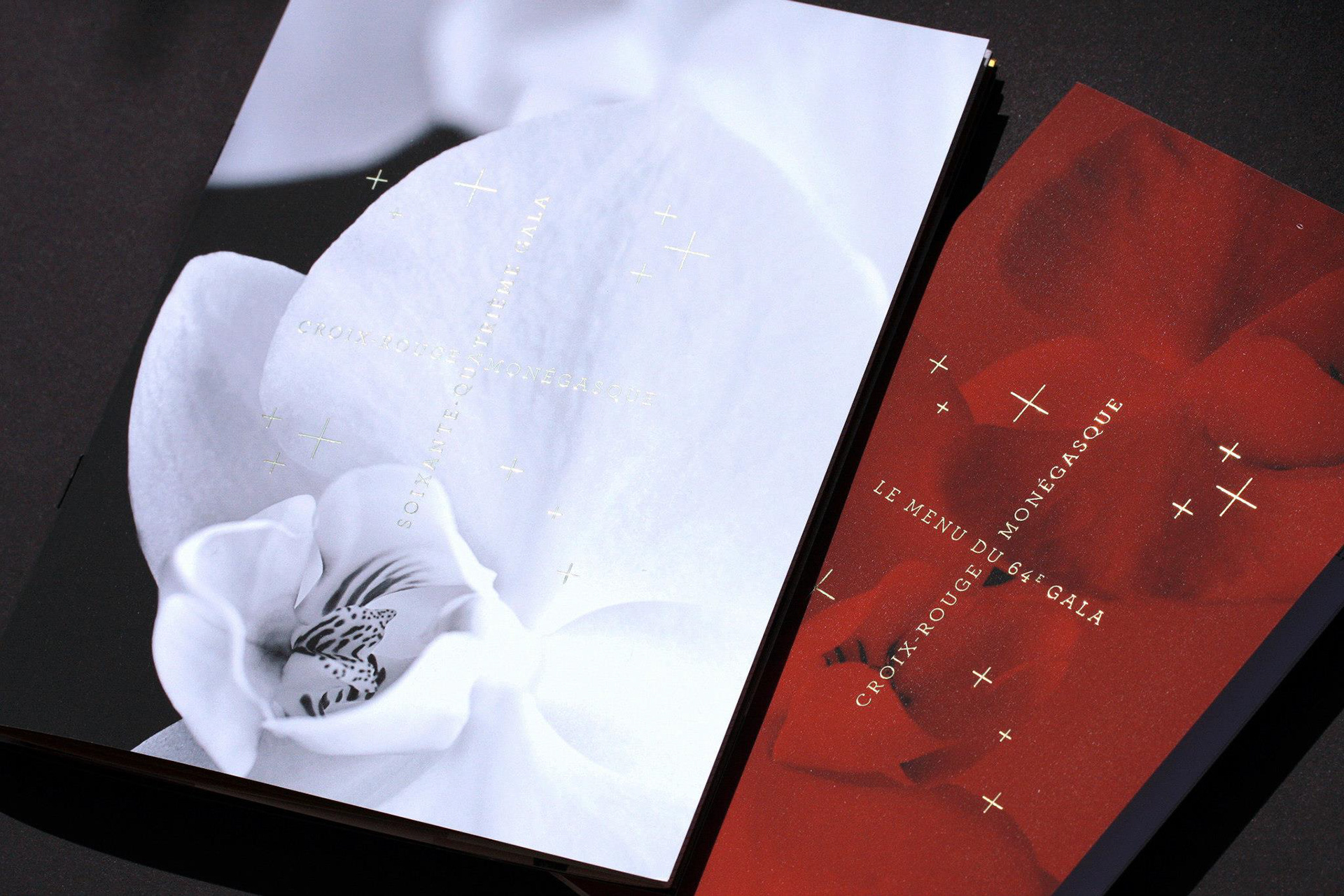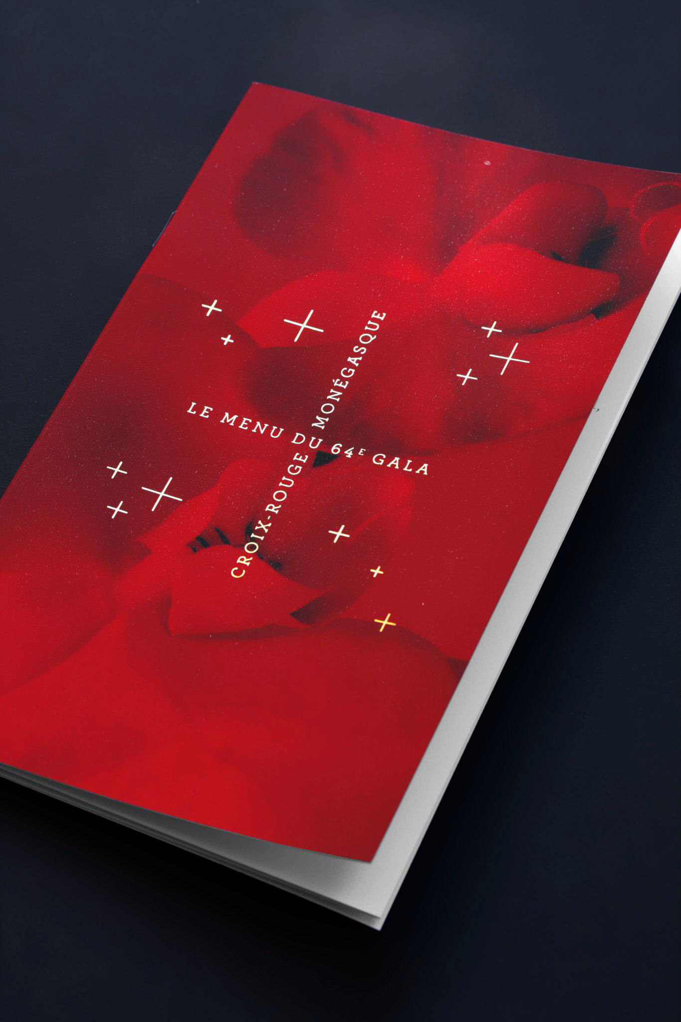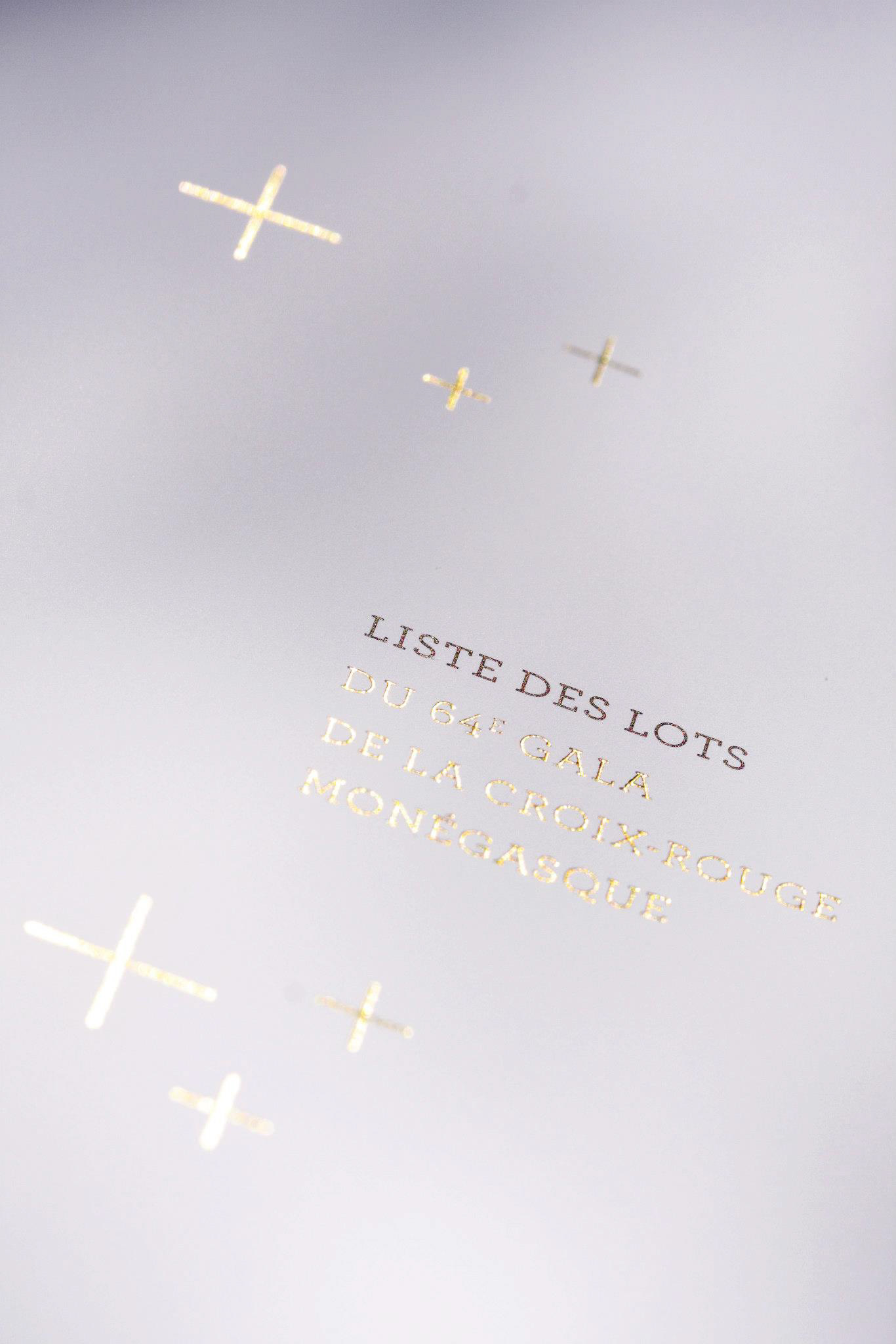 Programme et Menu pour le 64e Gala de la Croix-Rouge Monégasque. Finition pelliculée peau de pèche et dorures à chaud, calques dorés métalliques.
