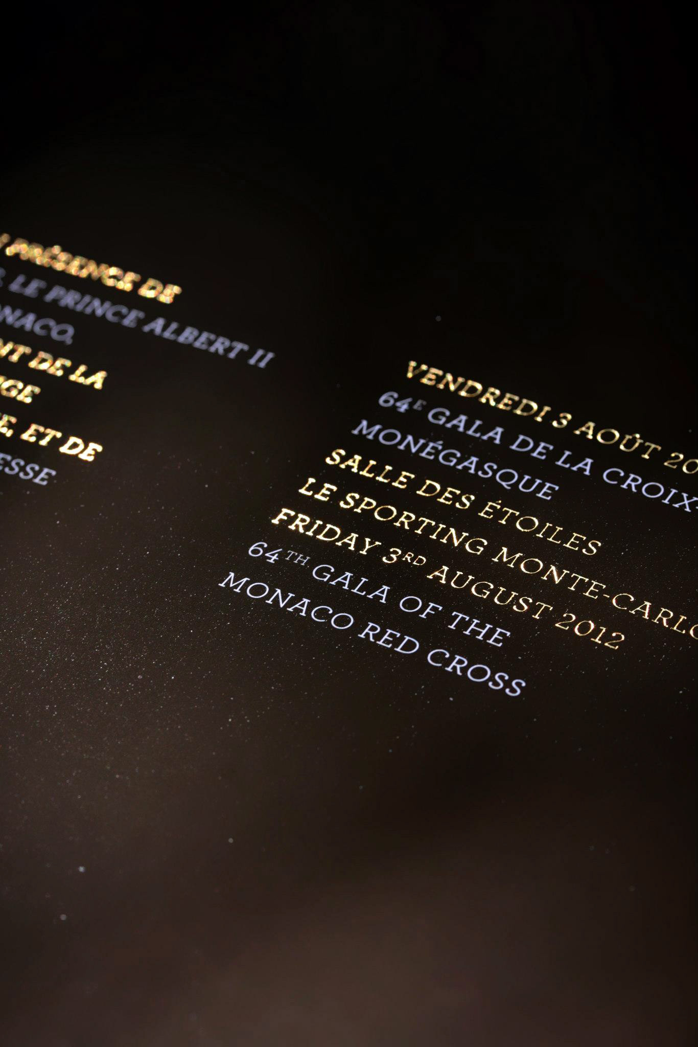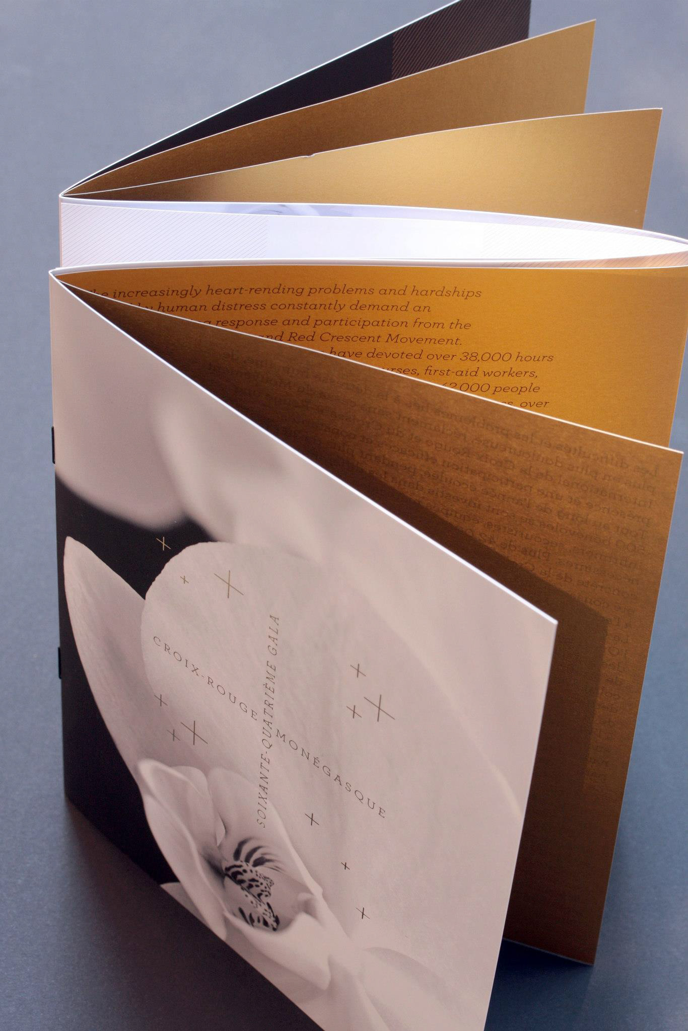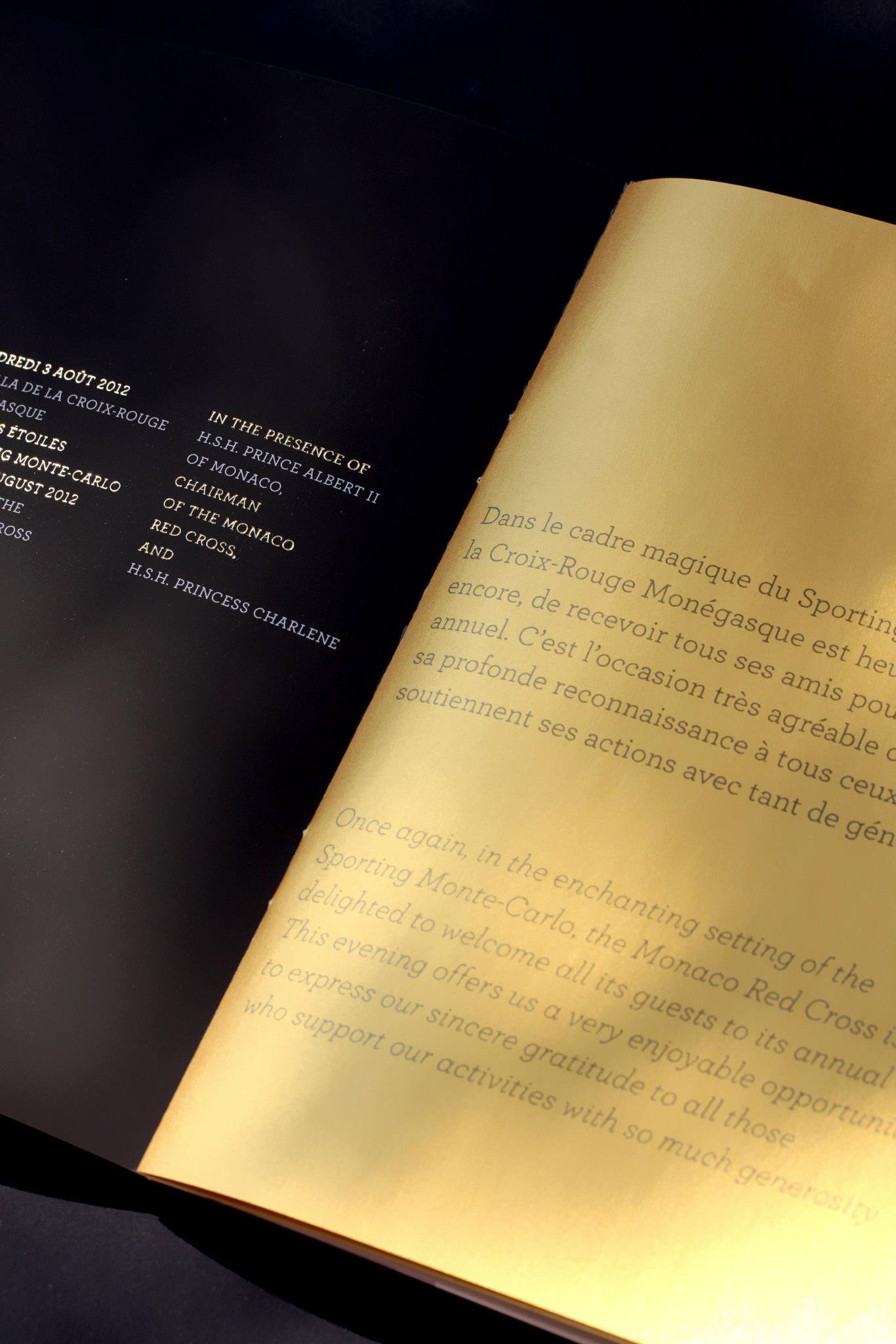 Programme et Menu pour le 64e Gala de la Croix-Rouge Monégasque. Finition pelliculée peau de pèche et dorures à chaud, calques dorés métalliques.