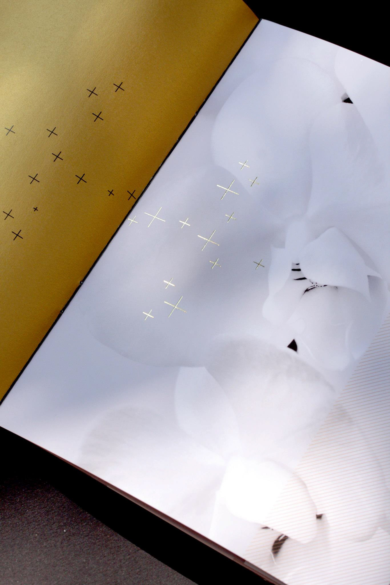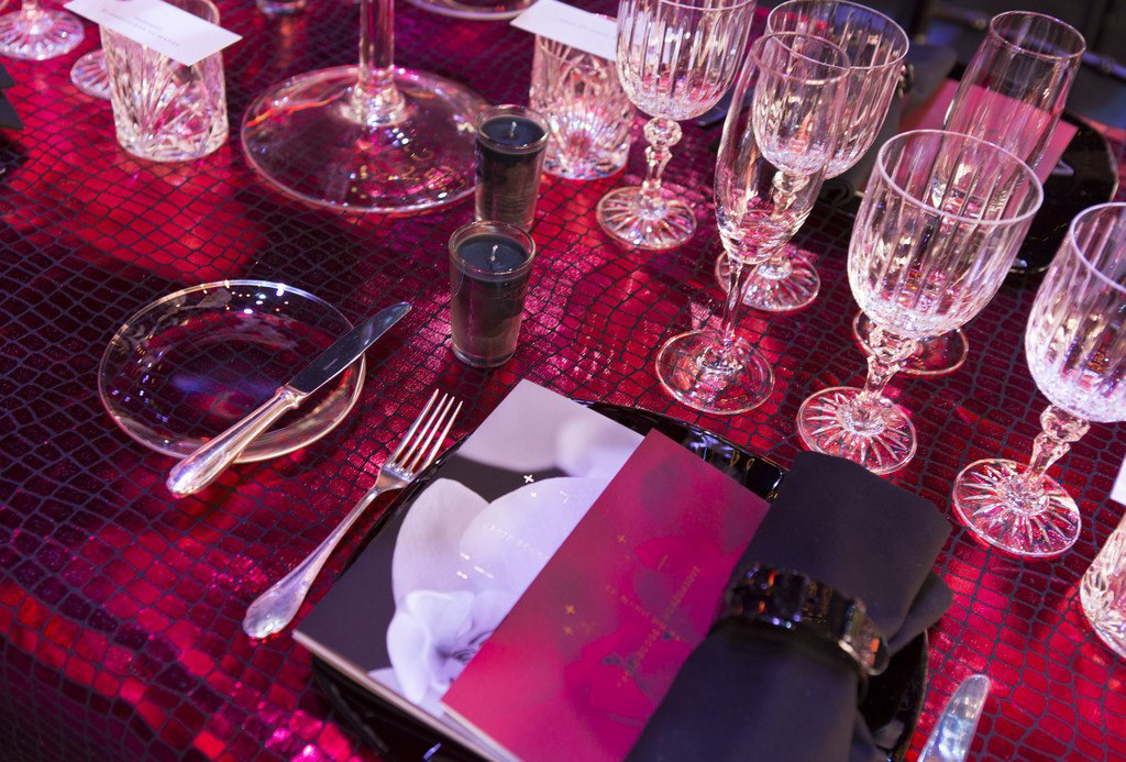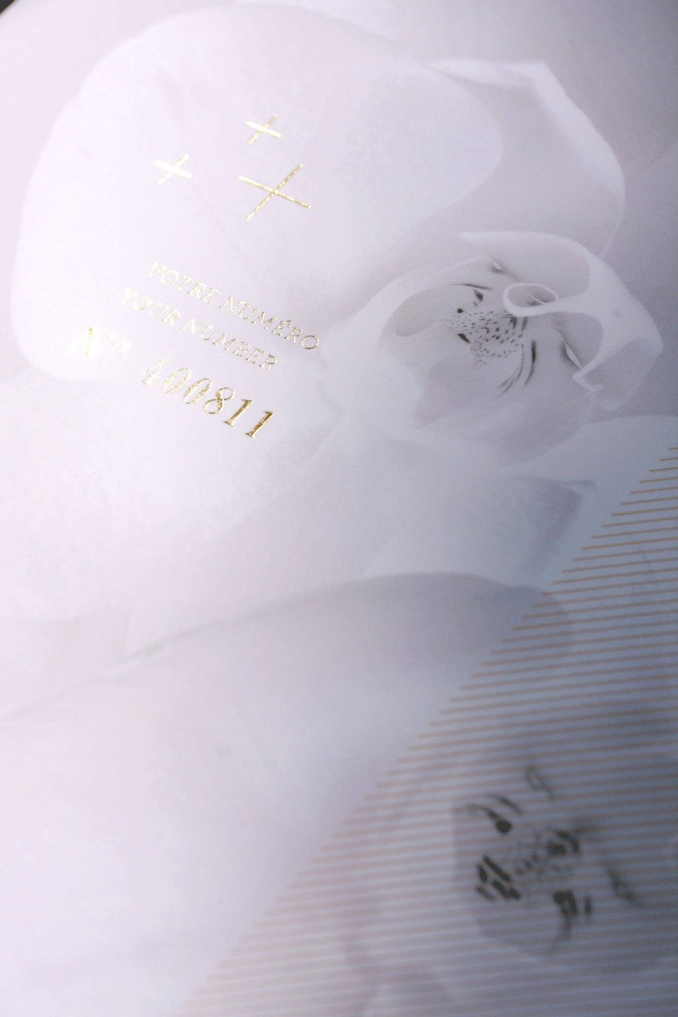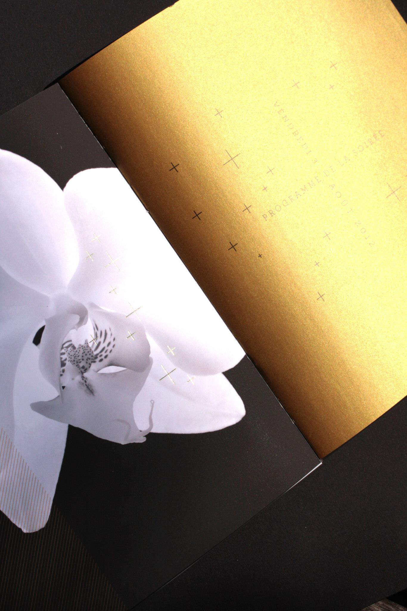 Programme et Menu pour le 64e Gala de la Croix-Rouge Monégasque. Finition pelliculée peau de pèche et dorures à chaud, calques dorés métalliques.