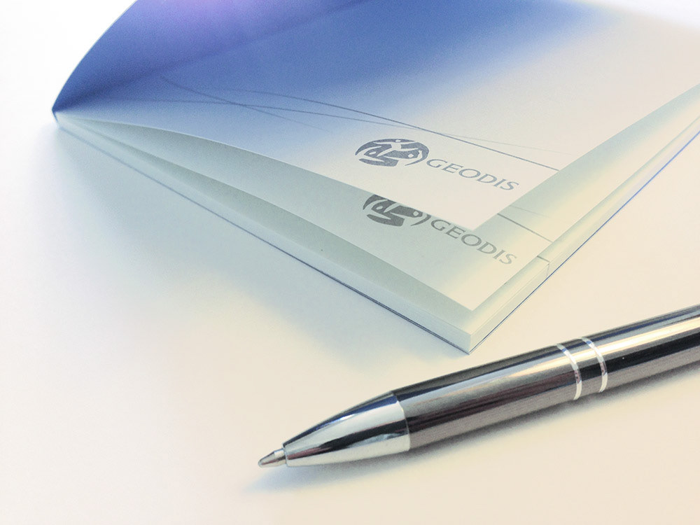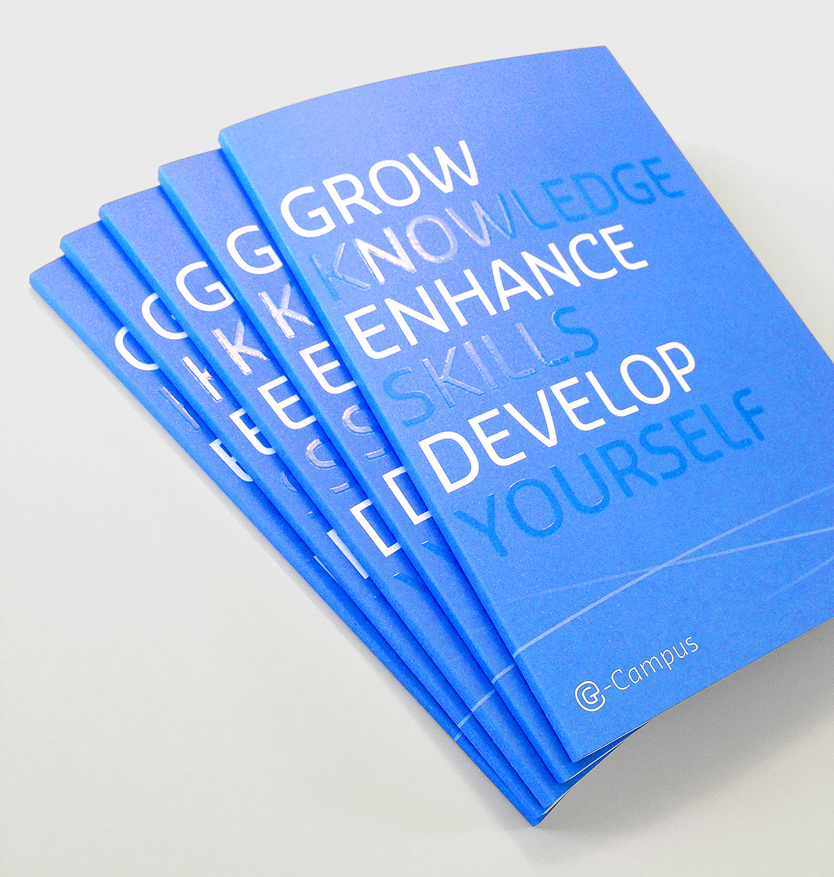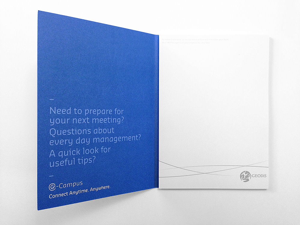 Pour Geodis, acteur majeur en logistique, La Manufacture à conçu cet outil destiné aux cadres supérieurs pour les motiver et accompagner durant leur formation e-learning par le programme intranet G-Campus. Le contraste de vernis sélectif et papier mat vient renforcer les codes couleur forts de la charte institutionnelle Geodis.