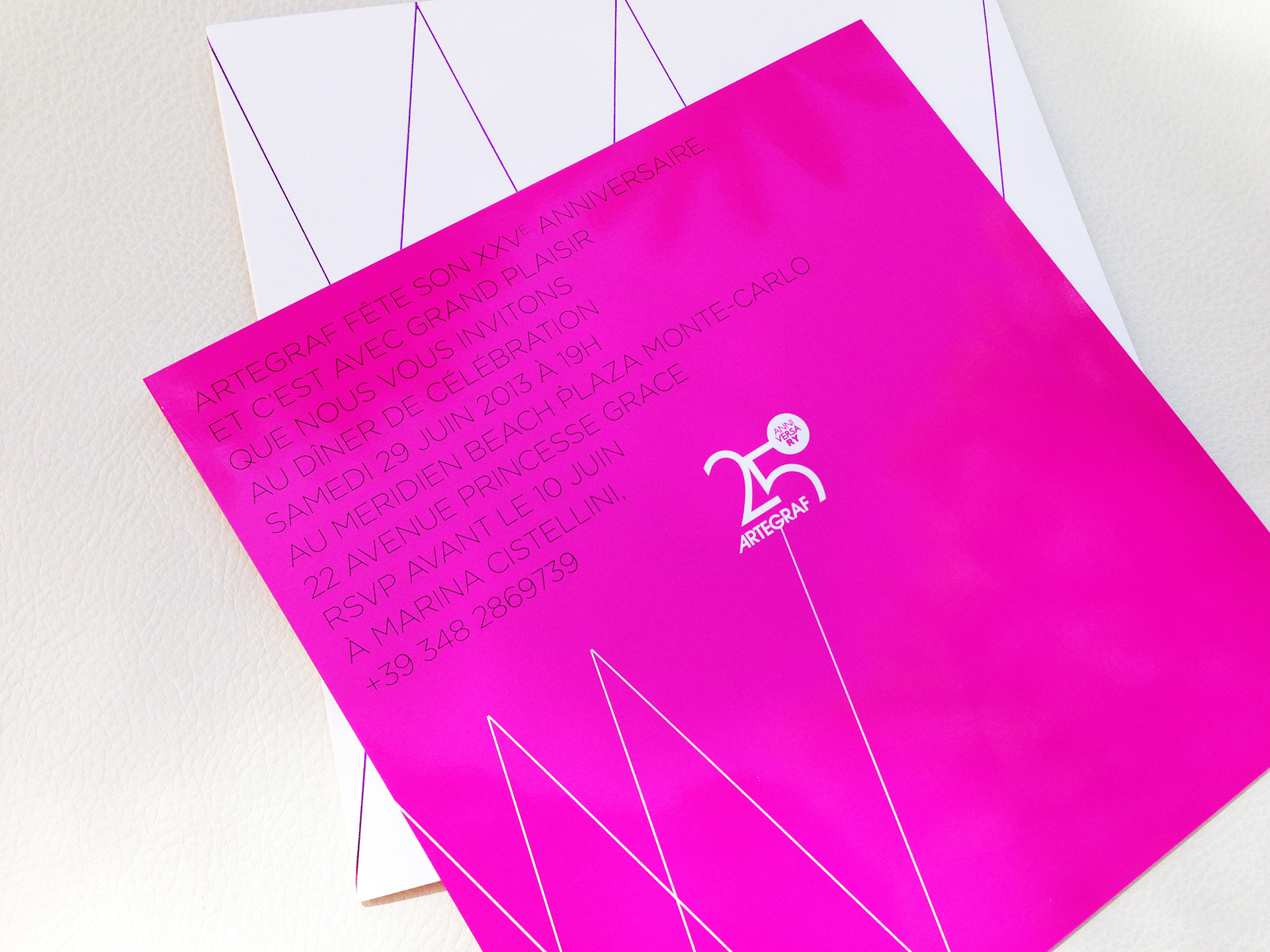 Conception de carton invitation haut de gamme pour la soirée de célébration du 25e anniversaire de la société Artegraf. Carton Cromolux, avec couleur à chaud métallique.