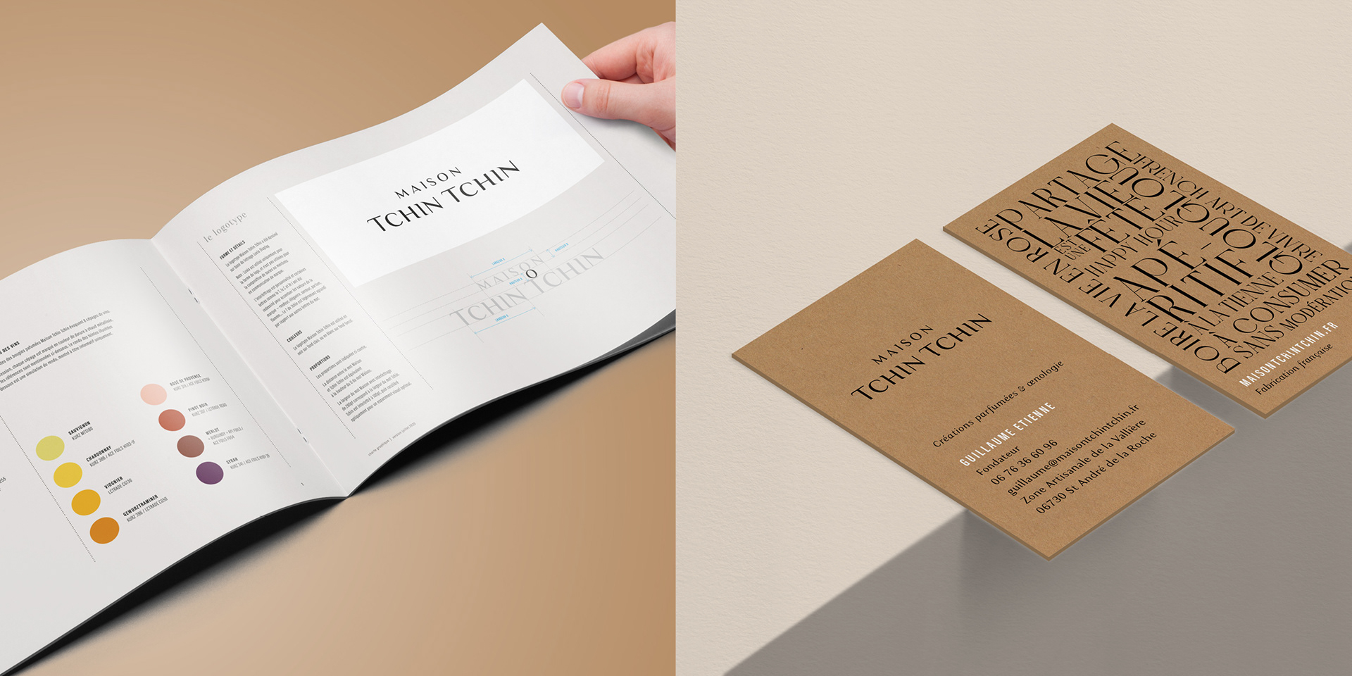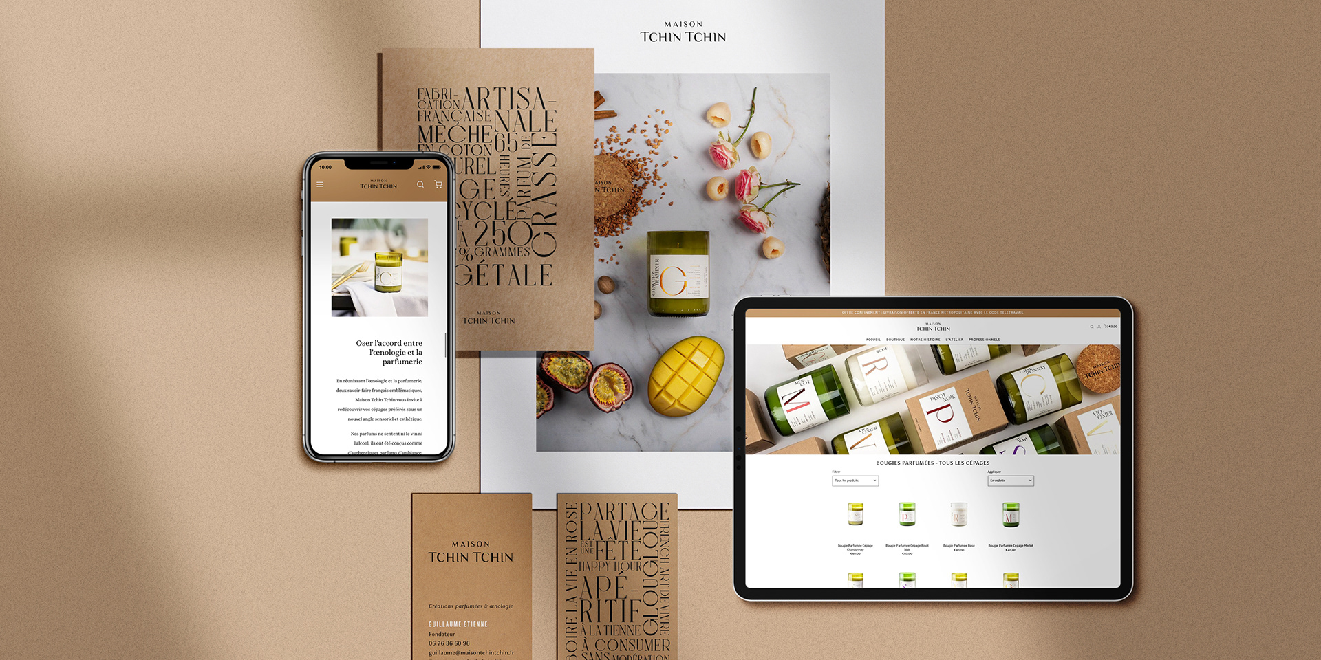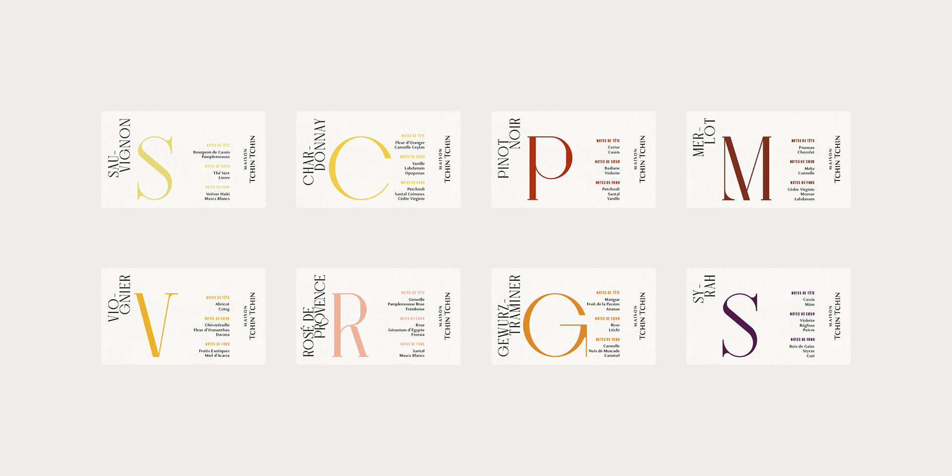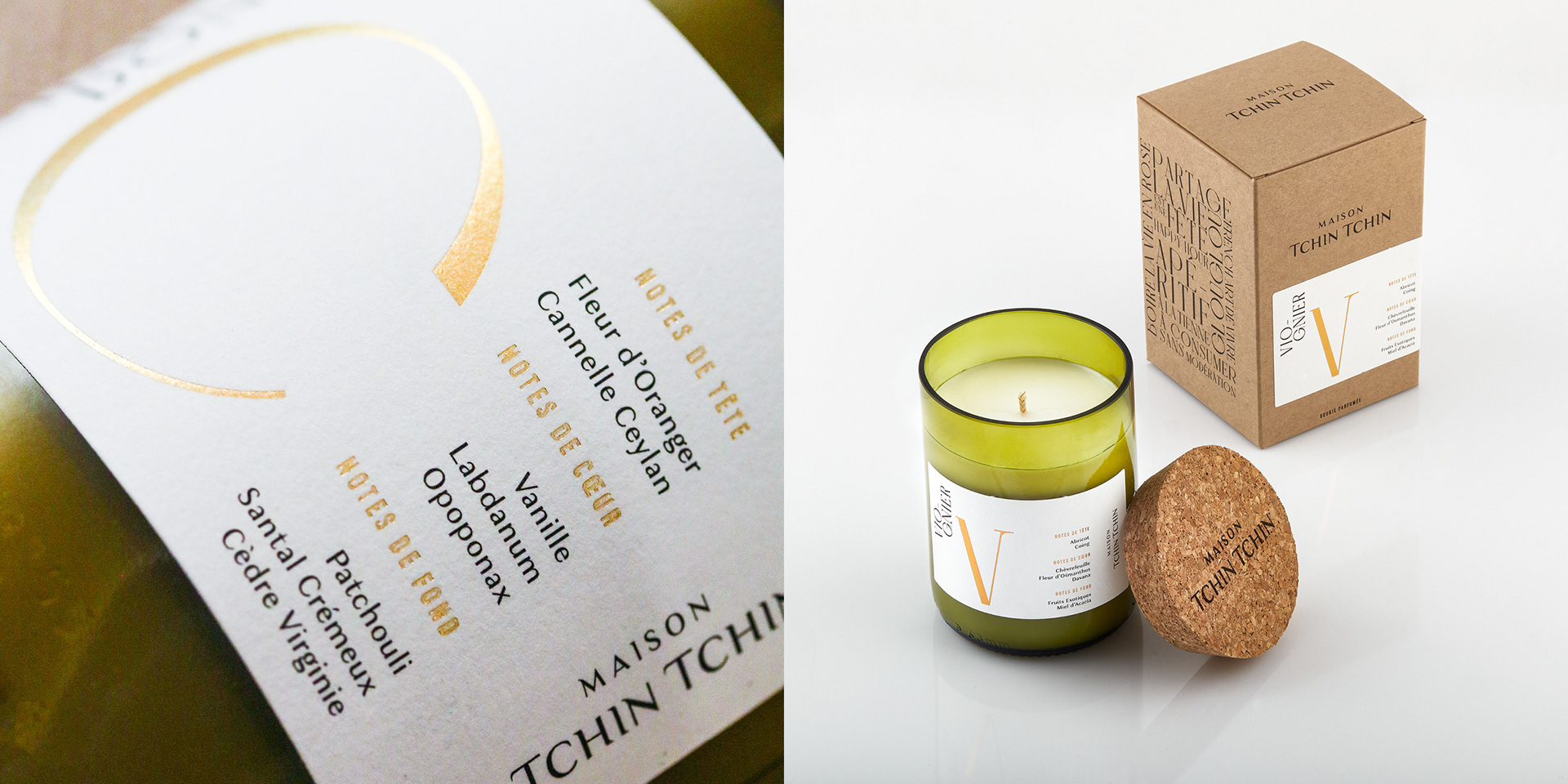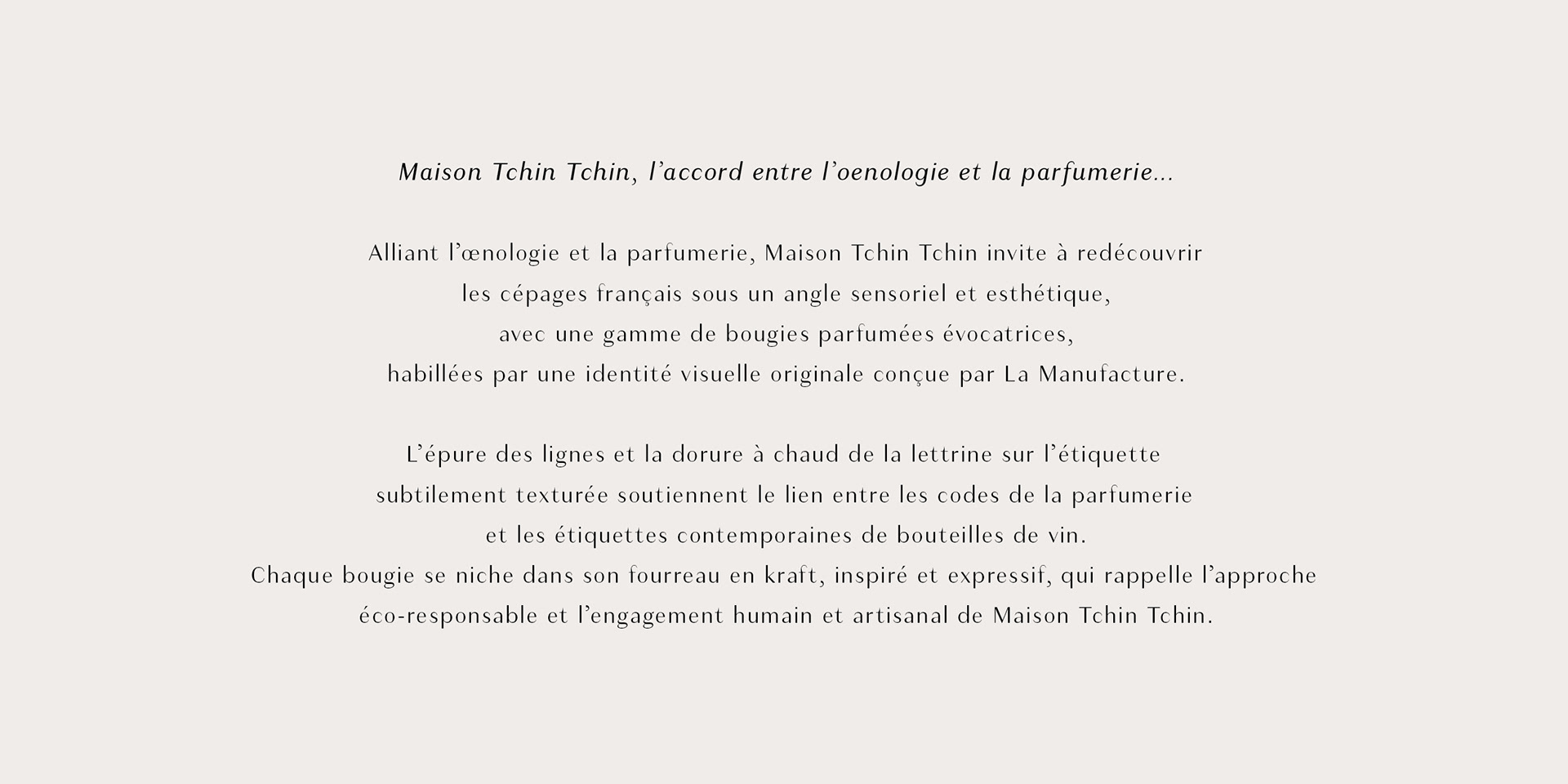 Alliant l’œnologie et la parfumerie, Maison Tchin Tchin invite à redécouvrir les cépages français sous un angle sensoriel et esthétique, avec une gamme de bougies parfumées évocatrices, habillées par une identité visuelle originale conçue par La Manufacture. L’épure des lignes et la dorure à chaud de la lettrine sur l’étiquette subtilement texturée soutiennent le lien entre les codes de la parfumerie et les étiquettes contemporaines de bouteilles de vin. Chaque bougie se niche dans son fourreau en kraft, inspiré et expressif, qui rappelle l’approche éco-responsable et l’engagement humain et artisanal de Maison Tchin Tchin.