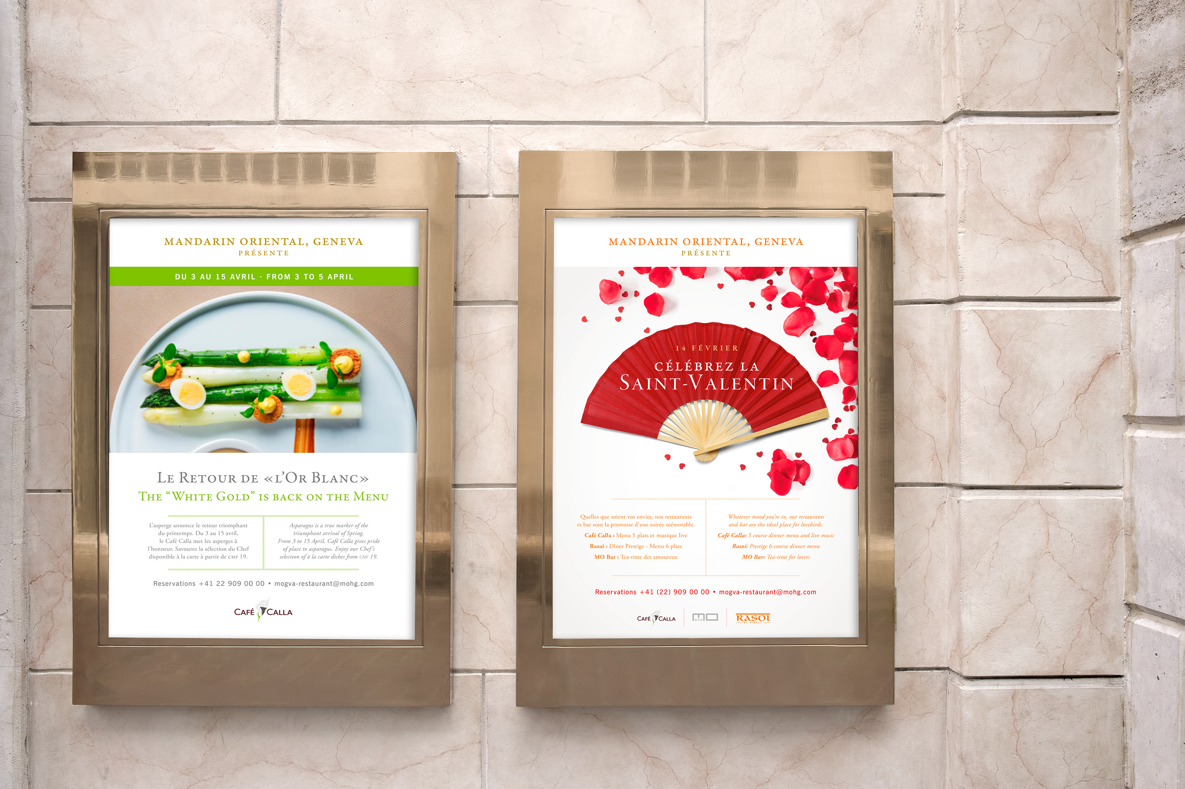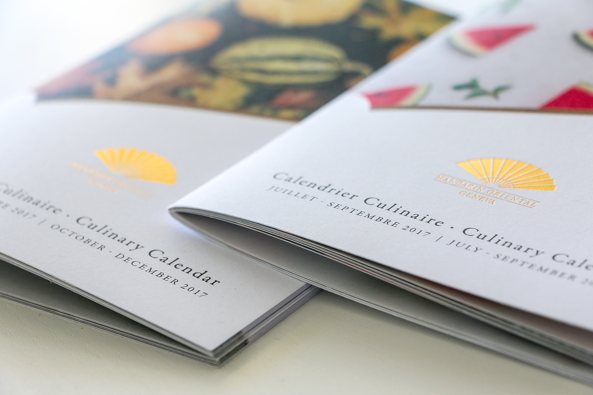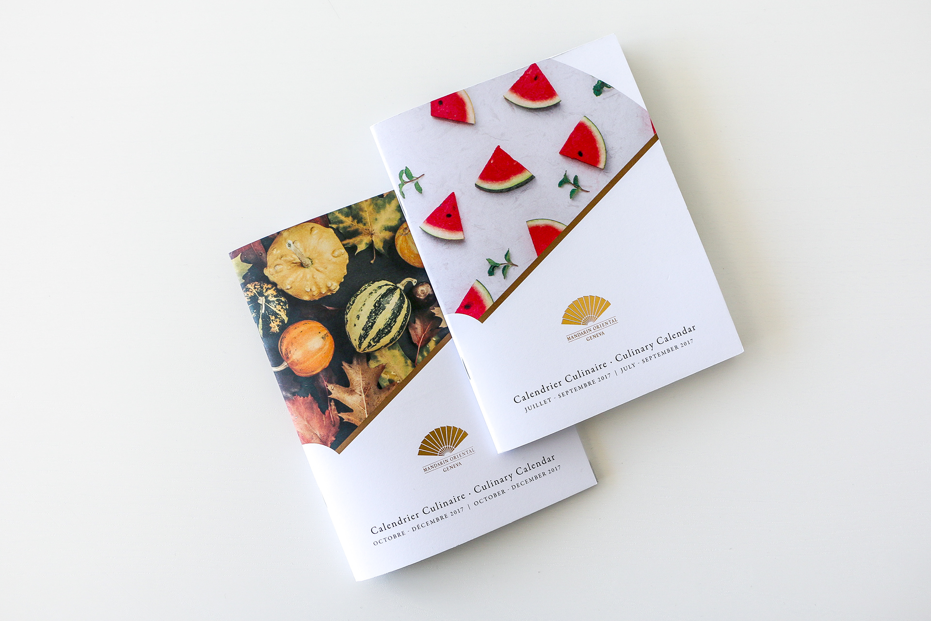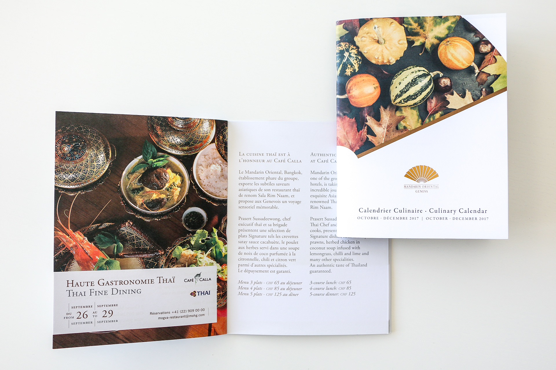 L'Hôtel Mandarin Oriental Geneva édite un petit guide événementiel à chaque nouvelle saison, pour communiquer sur les actualités des restaurants et bar de l'hôtel.