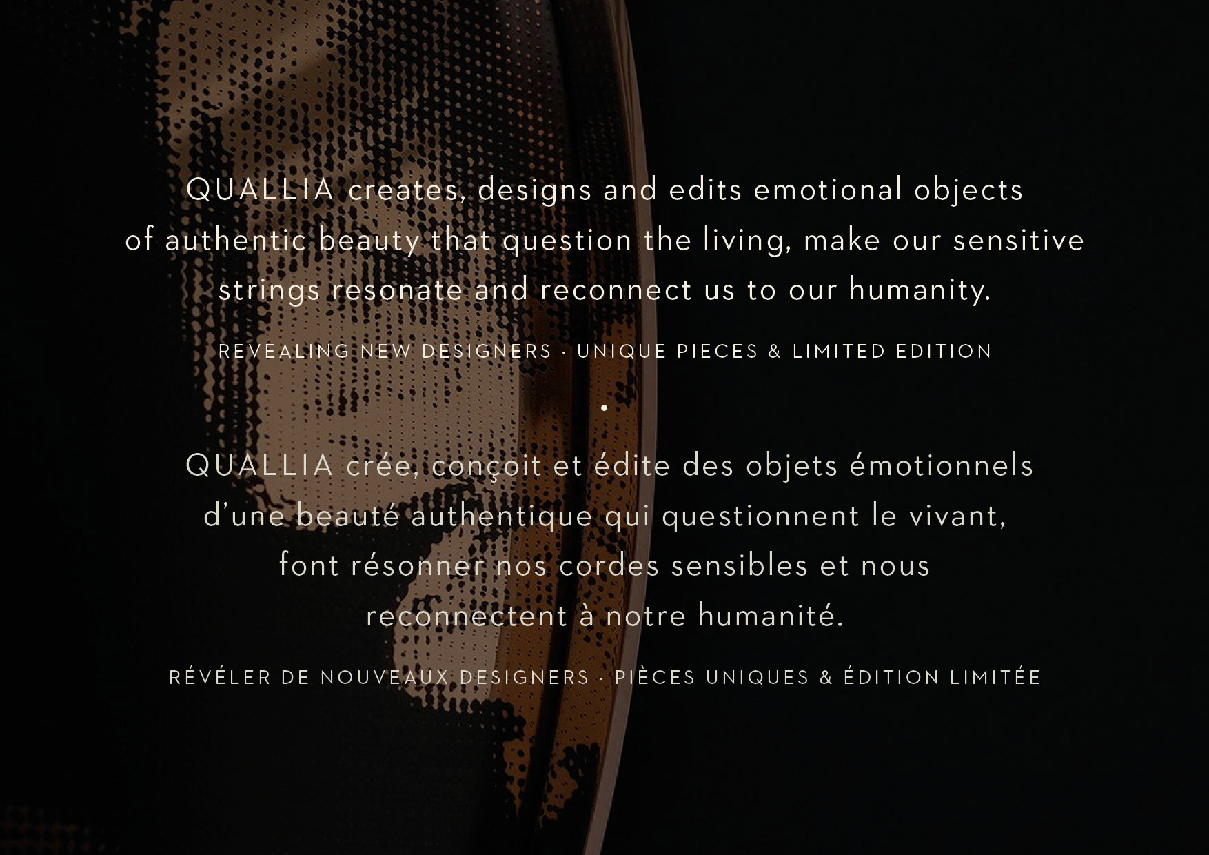Conception d'identité visuelle pour Quallia, consultant en art & design. Quallia crée, conçoit et édite des objets émotionnels d’une beauté authentique qui questionnent le vivant, font résonner nos cordes sensibles et nous reconnectent à notre humanité. Désirés, désirables, ces objets nous parlent, nous titillent, nous submergent, nous font atteindre ces sentiments indescriptibles et intenses, ces fameux "qualias" qui donnent à la vie toute sa richesse. Quallia conseille les architectes d'intérieur et des clients privés, des groupes hôteliers, des entreprises. Sa quête dans chaque mission est de déceler le flux naturel, le tissage intérieur, le génie du lieu et trouver les objets qui entreront en résonance avec ce lieu et lui conféreront permanence et harmonie. Il s'agit d'inspirer un sentiment de respect pour les objets d'une maison en tant qu'œuvres d'art et de design.