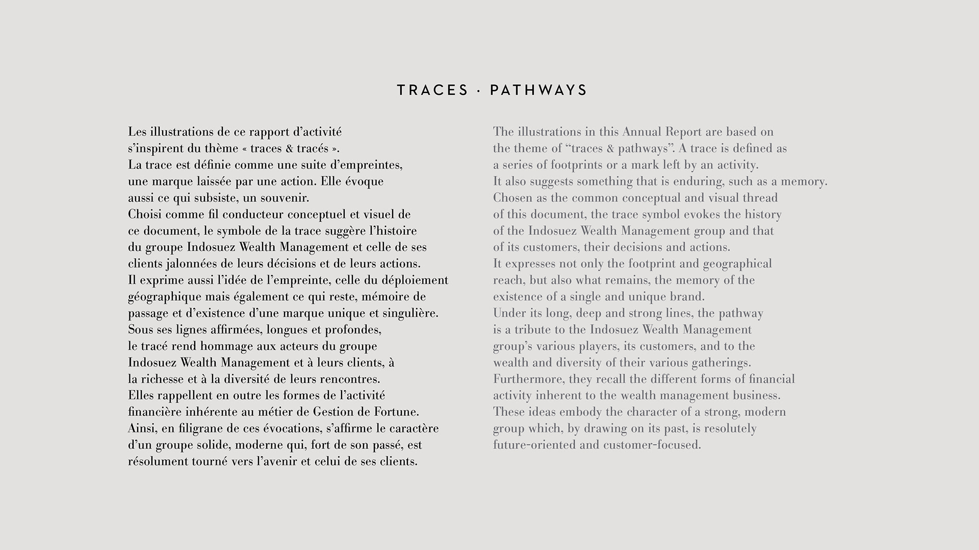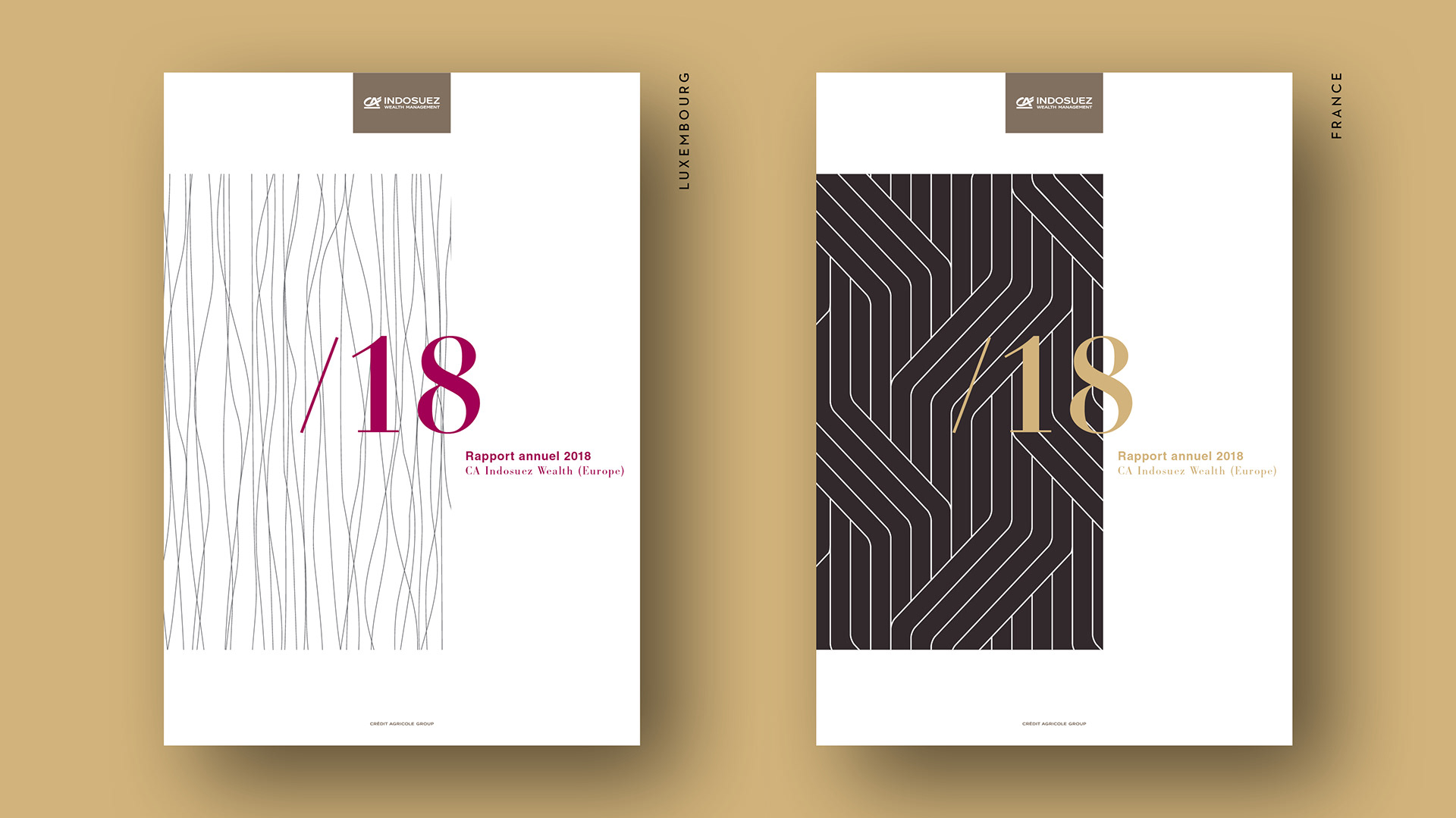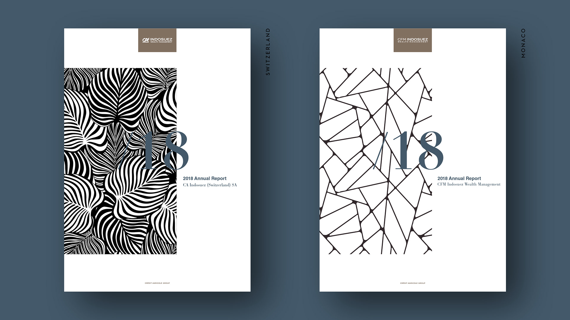 Une fois de plus, le groupe financier Indosuez Wealth Management a confié la conception graphique et la réalisation de ses rapports annuels à La Manufacture. Pour harmoniser une collection de 4 versions (Suisse, Monaco, Luxembourg, France), La Manufacture a proposé un fil conducteur visuel inspiré par la symbolique de traces & tracés. Une direction artistique s’exprimant par une collection de visuels graphiques expressifs qui rythment les propos et les contenus institutionnels au fil de pages.