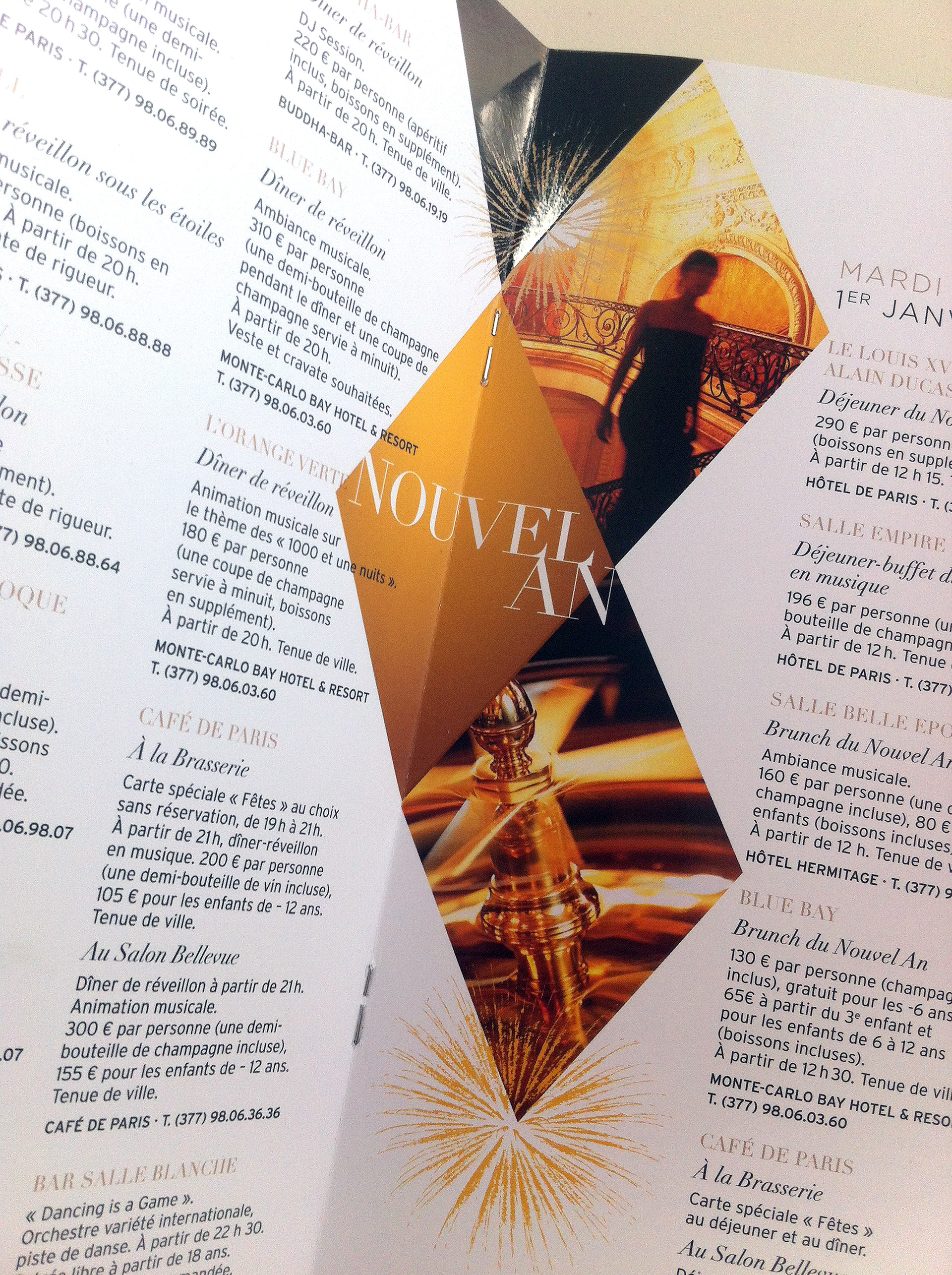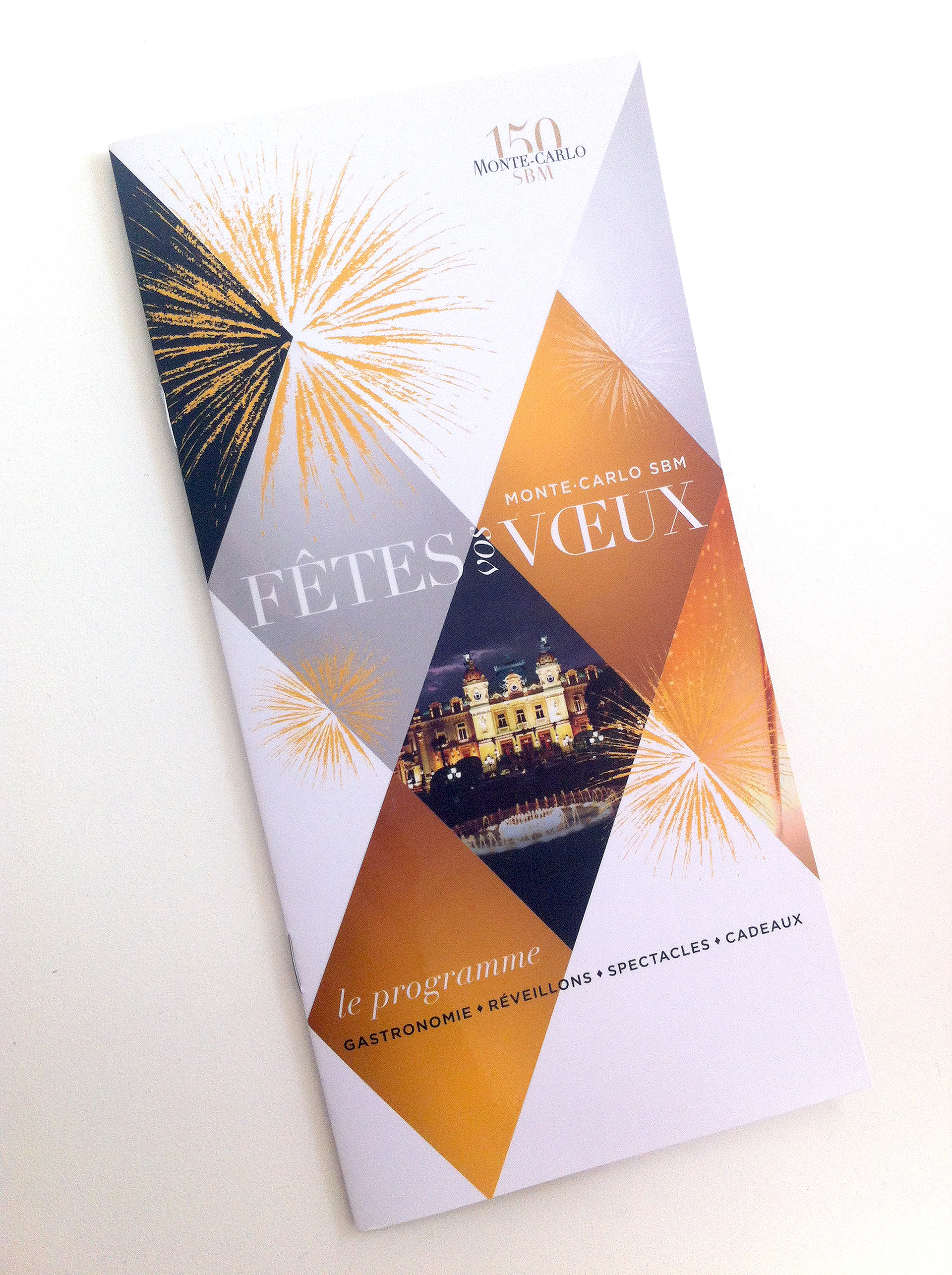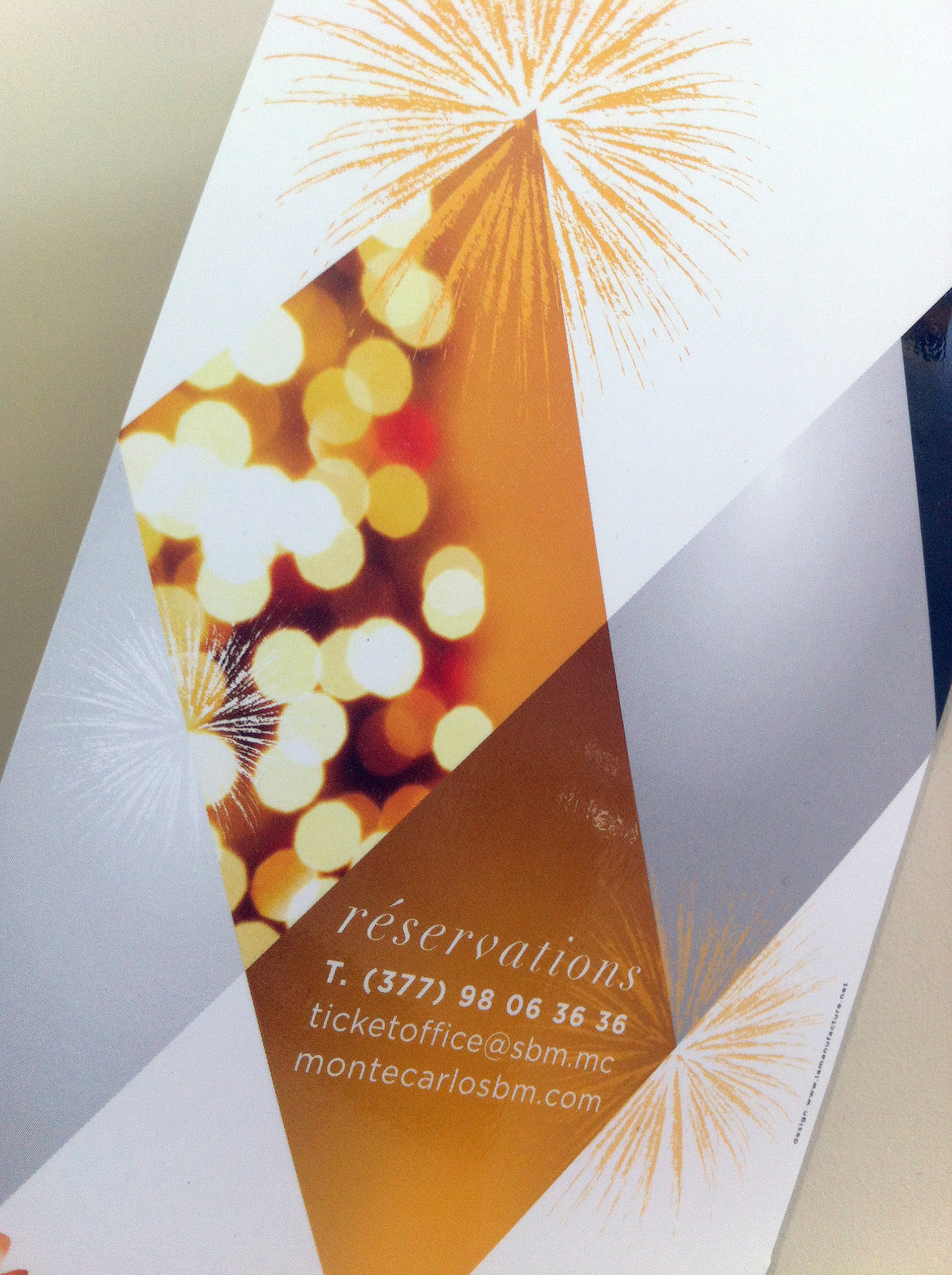Conception de campagne promotionnelle pour les Réveillons et événements de fin d'année à Monte-Carlo au sein des établissements prestigieux Monte-Carlo SBM —hôtels, restaurants, casinos, salles de spectacle. Affichage, programme, e-mailing...