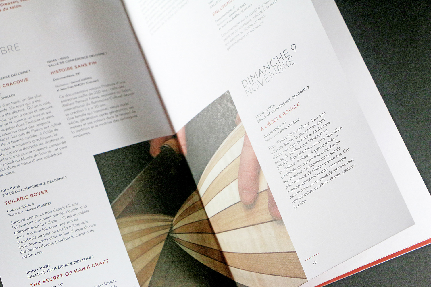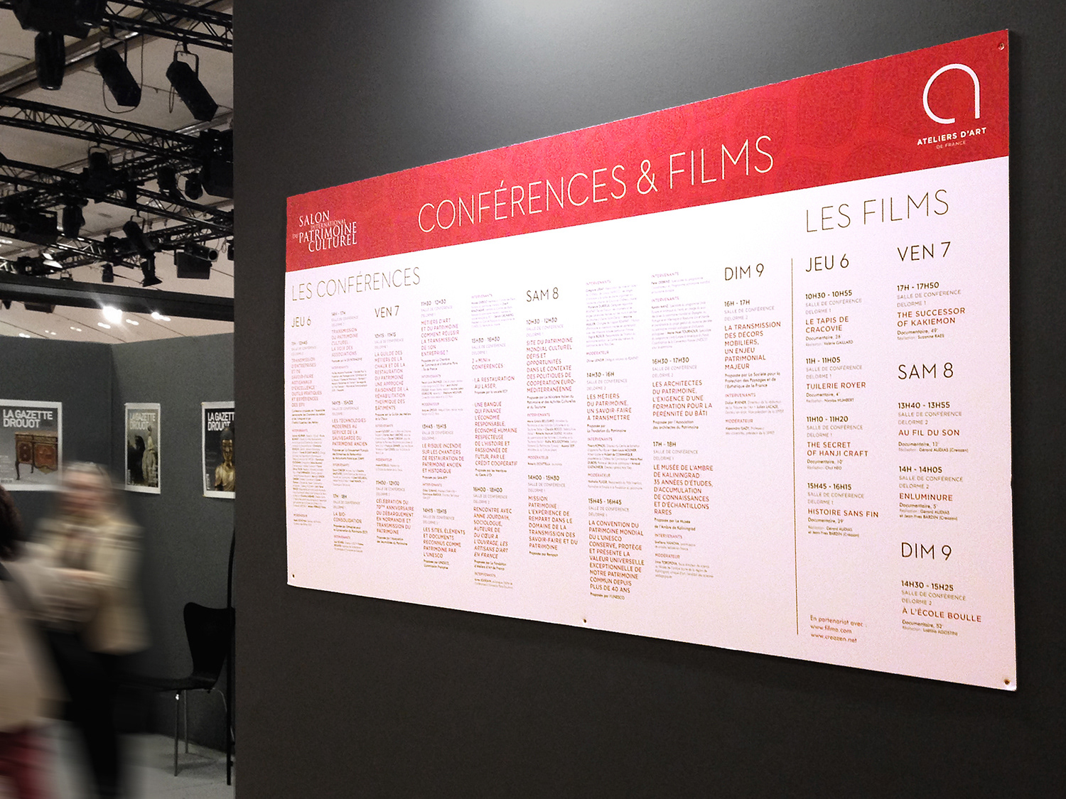 Du visuel générique de l'exposition, par la signalétique, aux supports de communication —catalogue, programme, affichage, invitations, billetterie— La Manufacture a réalisé une fois de plus l'identité visuelle du Salon International du Patrimoine Culturel 2014, organisé au Carrousel du Louvre par les Ateliers d'Art de France.