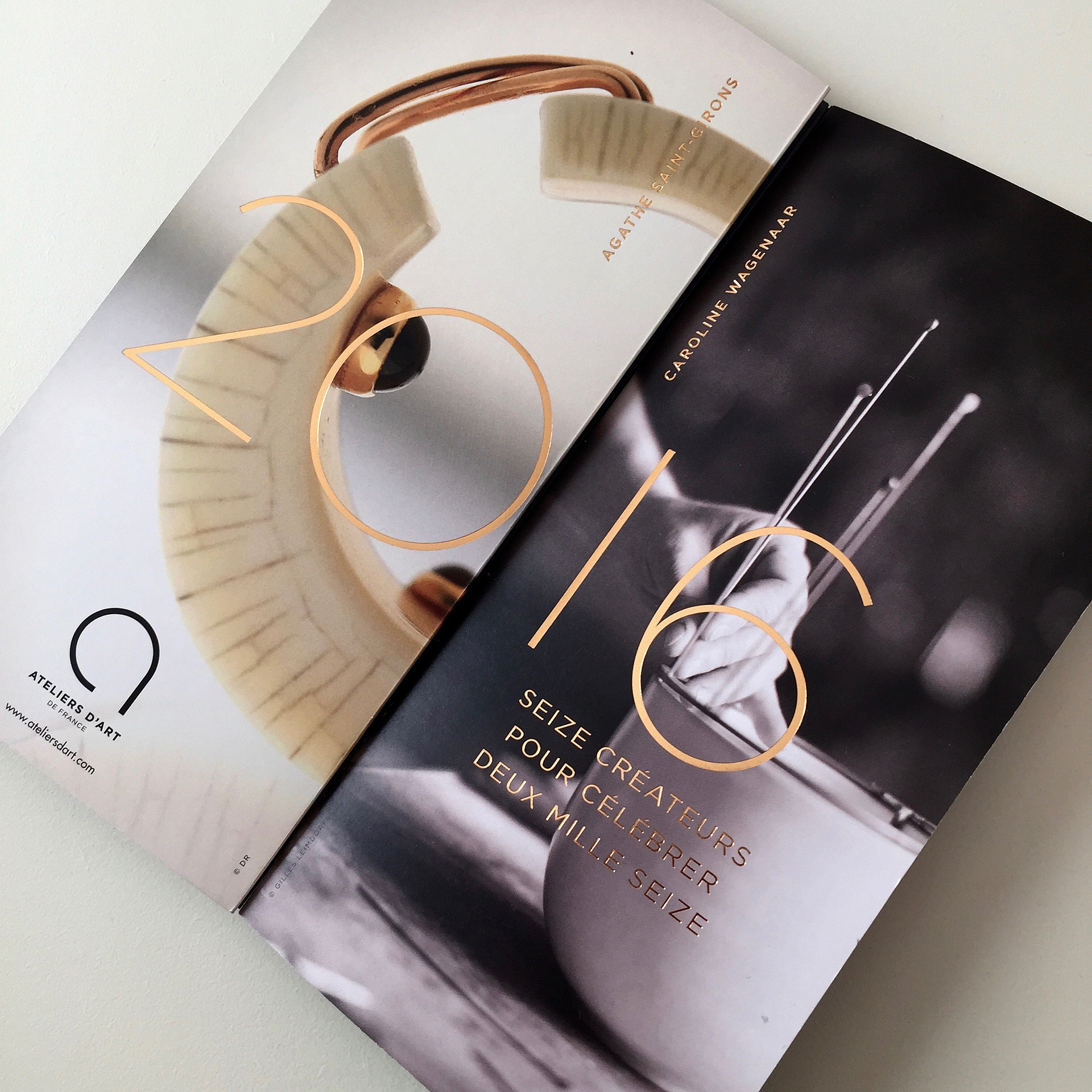 Seize créateurs pour célébrer deux-mille seize. Révéler toute la beauté et la créativité de l’artisanat d’art dans une carte de vœux-objet qui donne envie de découvrir, de regarder, de toucher, et de garder, à l’instar des œuvres uniques des créateurs artisans d’art. Un format compact et généreux à la fois, un pliage simple mais inattendu, des visuels évocateurs réhaussés d’une typographie moderne fine et ciselée en bronze à chaud brillant, et des vœux exprimés sur un marque page encarté…