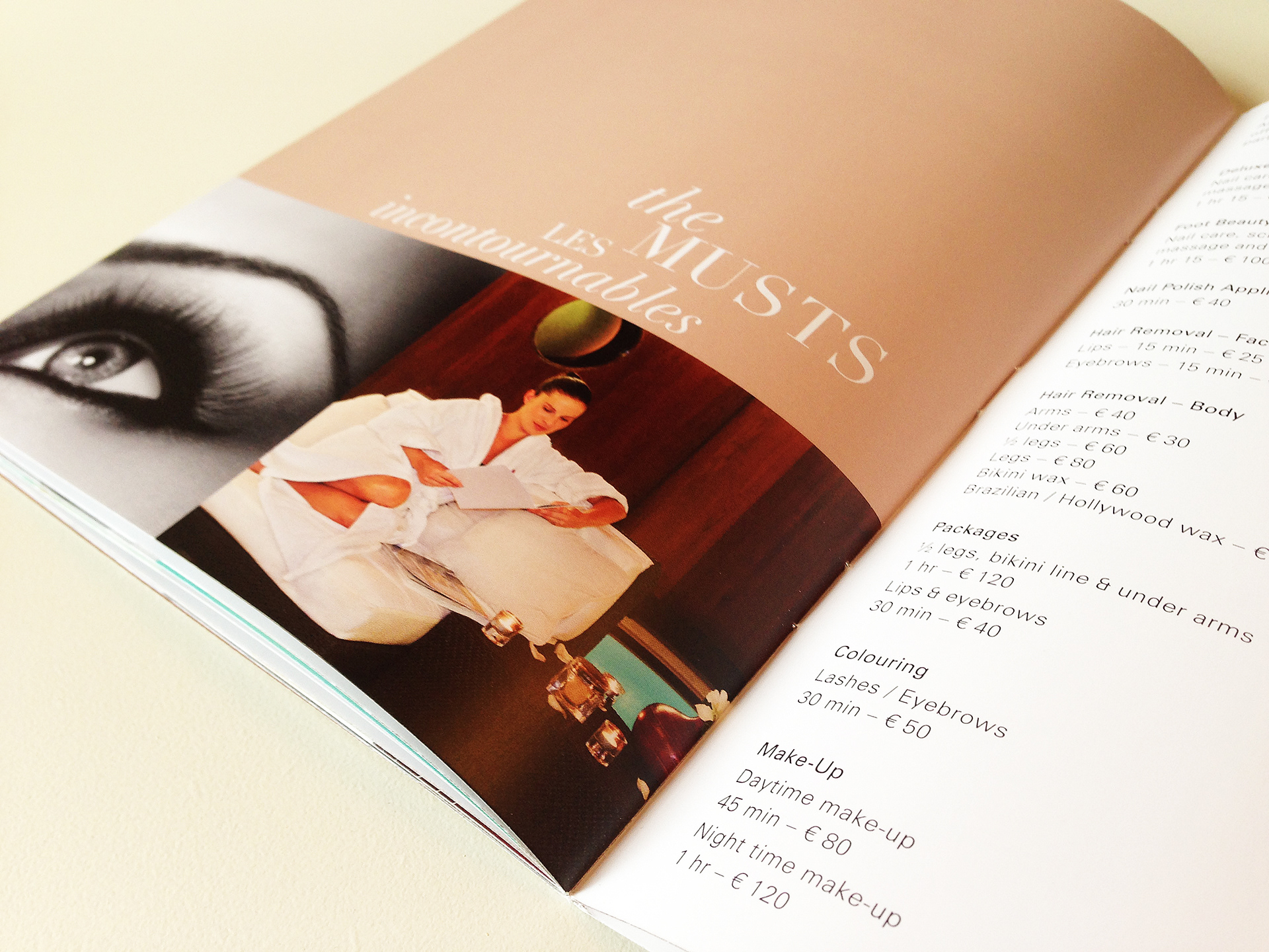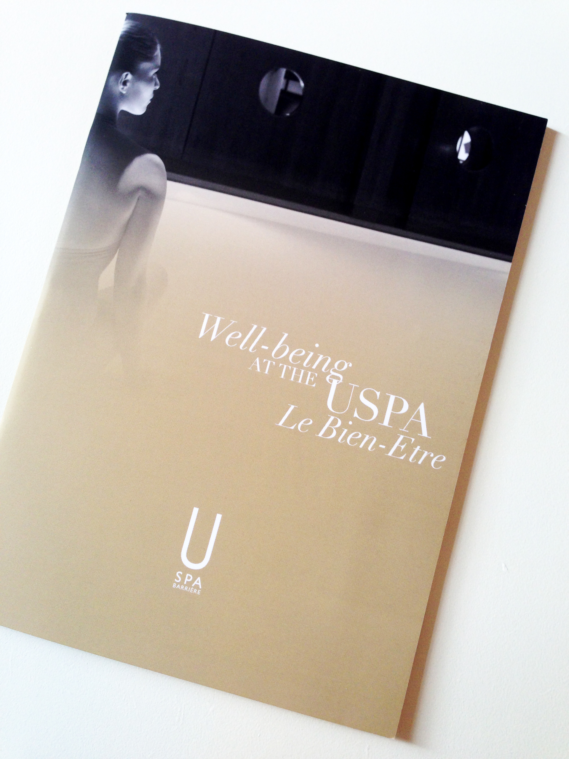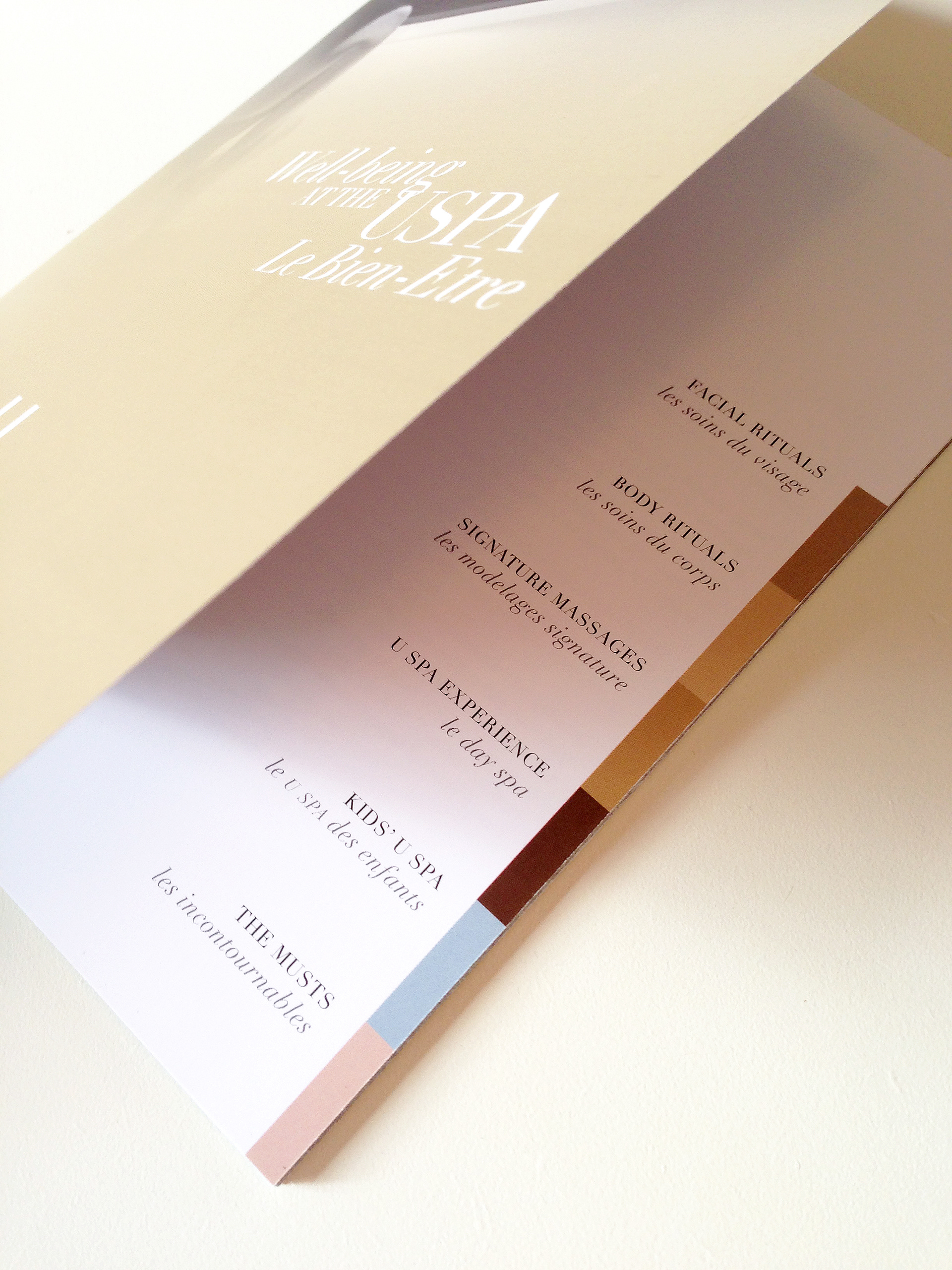 Conception et réalisation de la brochure de présentation des soins proposés à l'USPA Shiseido de l'Hôtel Fouquet's Barrière, Paris.
